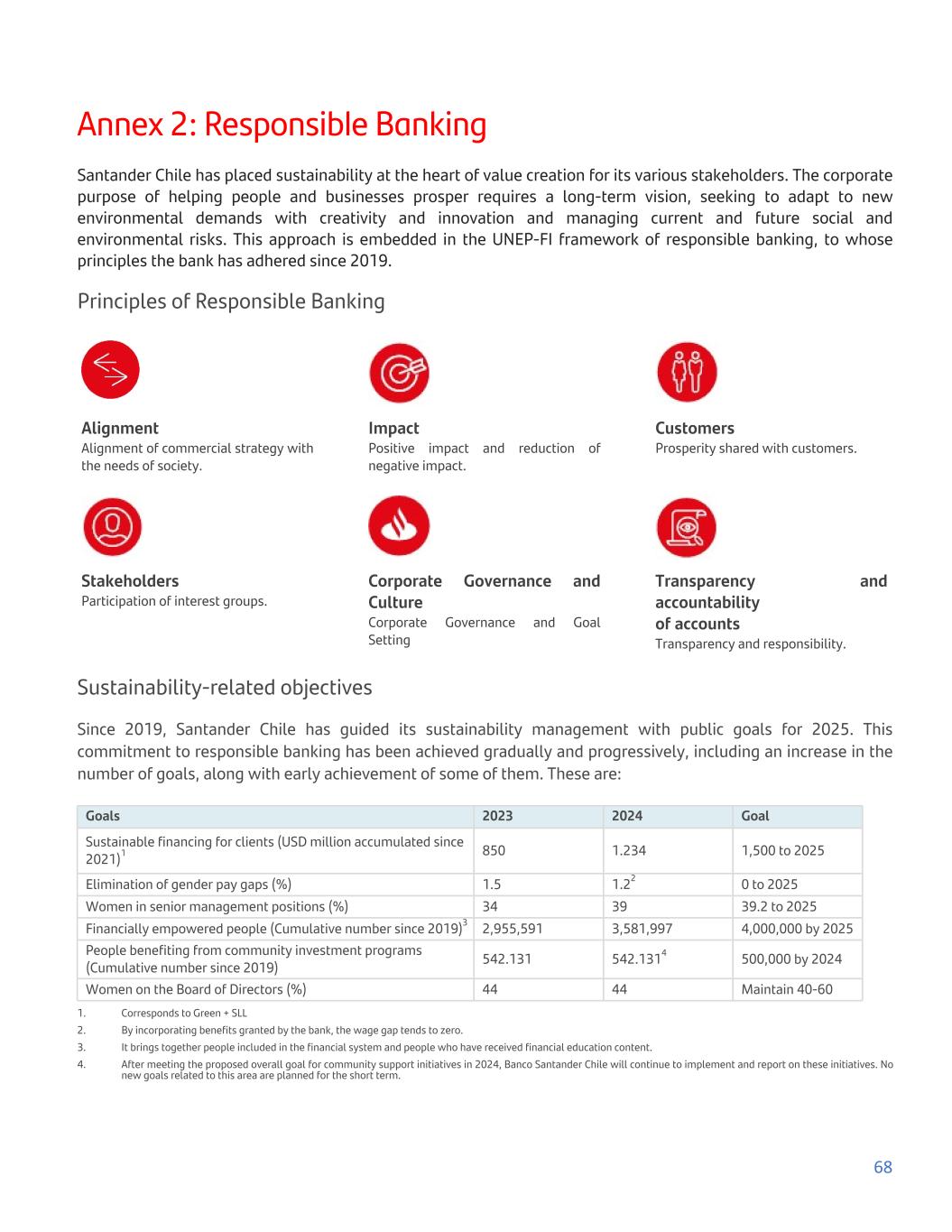 Annex 2: Responsible Banking Santander Chile has placed sustainability at the heart of value creation for its various stakeholders. The corporate purpose of helping people and businesses prosper requires a long-term vision, seeking to adapt to new environmental demands with creativity and innovation and managing current and future social and environmental risks. This approach is embedded in the UNEP-FI framework of responsible banking, to whose principles the bank has adhered since 2019. Principles of Responsible Banking Alignment Alignment of commercial strategy with the needs of society. Impact Positive impact and reduction of negative impact. Customers Prosperity shared with customers. Stakeholders Participation of interest groups. Corporate Governance and Culture Corporate Governance and Goal Setting Transparency and accountability of accounts Transparency and responsibility. Sustainability-related objectives Since 2019, Santander Chile has guided its sustainability management with public goals for 2025. This commitment to responsible banking has been achieved gradually and progressively, including an increase in the number of goals, along with early achievement of some of them. These are: Goals 2023 2024 Goal Sustainable financing for clients (USD million accumulated since 2021)1 850 1.234 1,500 to 2025 Elimination of gender pay gaps (%) 1.5 1.22 0 to 2025 Women in senior management positions (%) 34 39 39.2 to 2025 Financially empowered people (Cumulative number since 2019)3 2,955,591 3,581,997 4,000,000 by 2025 People benefiting from community investment programs (Cumulative number since 2019) 542.131 542.1314 500,000 by 2024 Women on the Board of Directors (%) 44 44 Maintain 40-60 1. Corresponds to Green + SLL 2. By incorporating benefits granted by the bank, the wage gap tends to zero. 3. It brings together people included in the financial system and people who have received financial education content. 4. After meeting the proposed overall goal for community support initiatives in 2024, Banco Santander Chile will continue to implement and report on these initiatives. No new goals related to this area are planned for the short term. 68