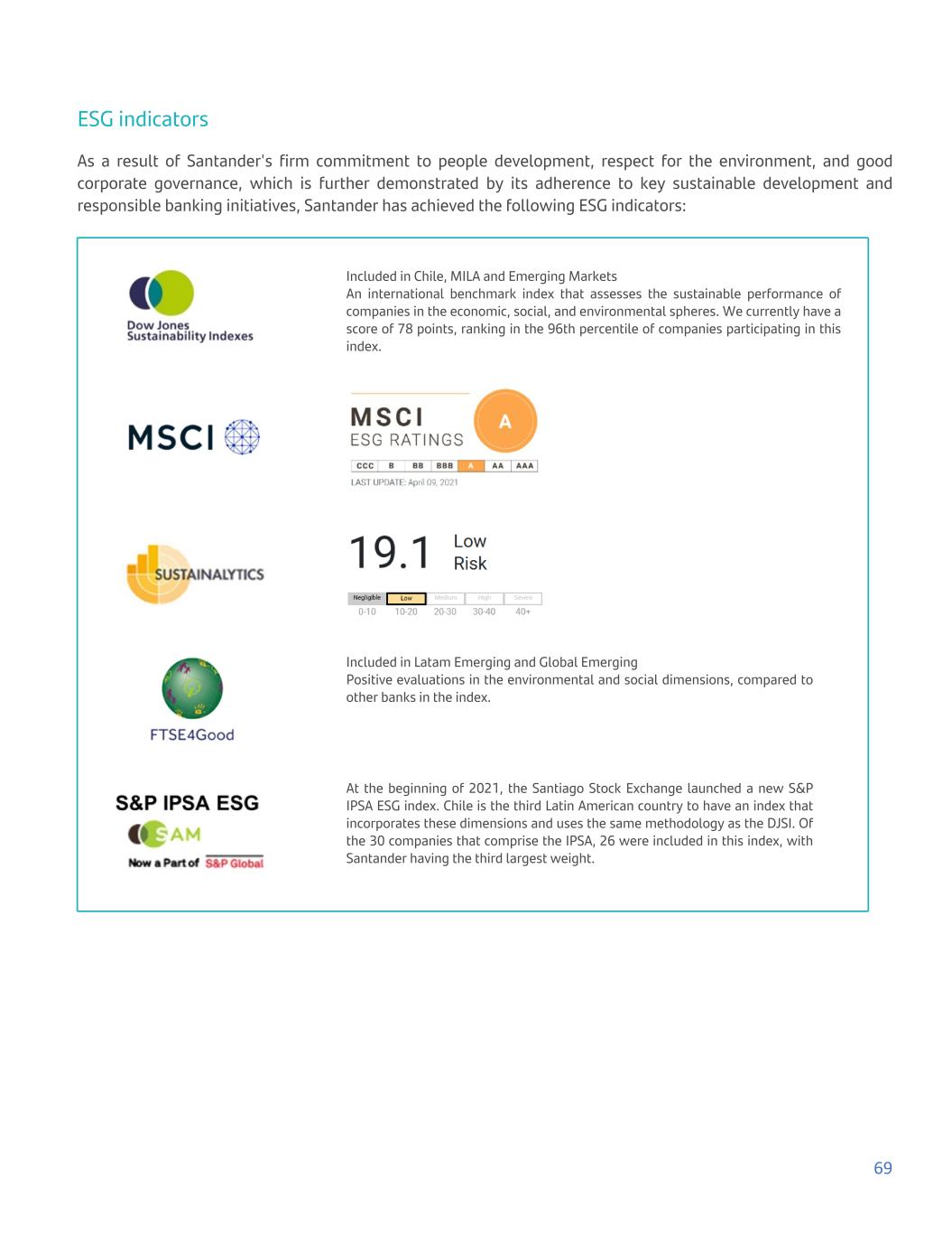 ESG indicators As a result of Santander's firm commitment to people development, respect for the environment, and good corporate governance, which is further demonstrated by its adherence to key sustainable development and responsible banking initiatives, Santander has achieved the following ESG indicators: Included in Chile, MILA and Emerging Markets An international benchmark index that assesses the sustainable performance of companies in the economic, social, and environmental spheres. We currently have a score of 78 points, ranking in the 96th percentile of companies participating in this index. Included in Latam Emerging and Global Emerging Positive evaluations in the environmental and social dimensions, compared to other banks in the index. At the beginning of 2021, the Santiago Stock Exchange launched a new S&P IPSA ESG index. Chile is the third Latin American country to have an index that incorporates these dimensions and uses the same methodology as the DJSI. Of the 30 companies that comprise the IPSA, 26 were included in this index, with Santander having the third largest weight. 69