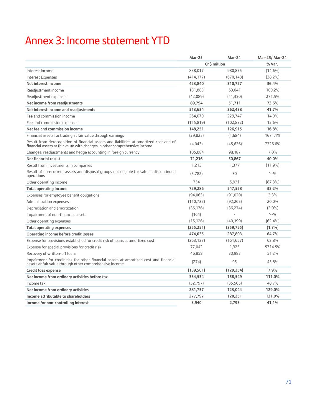 Annex 3: Income statement YTD Mar-25 Mar-24 Mar-25/ Mar-24 Ch$ million % Var. Interest income 838,017 980,875 (14.6%) Interest Expenses (414,177) (670,148) (38.2%) Net interest income 423,840 310,727 36.4% Readjustment income 131,883 63,041 109.2% Readjustment expenses (42,089) (11,330) 271.5% Net income from readjustments 89,794 51,711 73.6% Net interest income and readjustments 513,634 362,438 41.7% Fee and commission income 264,070 229,747 14.9% Fee and commission expenses (115,819) (102,832) 12.6% Net fee and commission income 148,251 126,915 16.8% Financial assets for trading at fair value through earnings (29,825) (1,684) 1671.1% Result from derecognition of financial assets and liabilities at amortized cost and of financial assets at fair value with changes in other comprehensive income (4,043) (45,636) 7326.6% Changes, readjustments and hedge accounting in foreign currency 105,084 98,187 7.0% Net financial result 71,216 50,867 40.0% Result from investments in companies 1,213 1,377 (11.9%) Result of non-current assets and disposal groups not eligible for sale as discontinued operations (5,782) 30 ‘--% Other operating income 754 5,931 (87.3%) Total operating income 729,286 547,558 33.2% Expenses for employee benefit obligations (94,063) (91,020) 3.3% Administration expenses (110,722) (92,262) 20.0% Depreciation and amortization (35,176) (36,274) (3.0%) Impairment of non-financial assets (164) - ‘--% Other operating expenses (15,126) (40,199) (62.4%) Total operating expenses (255,251) (259,755) (1.7%) Operating income before credit losses 474,035 287,803 64.7% Expense for provisions established for credit risk of loans at amortized cost (263,127) (161,657) 62.8% Expense for special provisions for credit risk 77,042 1,325 5714.5% Recovery of written-off loans 46,858 30,983 51.2% Impairment for credit risk for other financial assets at amortized cost and financial assets at fair value through other comprehensive income (274) 95 45.8% Credit loss expense (139,501) (129,254) 7.9% Net income from ordinary activities before tax 334,534 158,549 111.0% Income tax (52,797) (35,505) 48.7% Net income from ordinary activities 281,737 123,044 129.0% Income attributable to shareholders 277,797 120,251 131.0% Income for non-controlling interest 3,940 2,793 41.1% 71