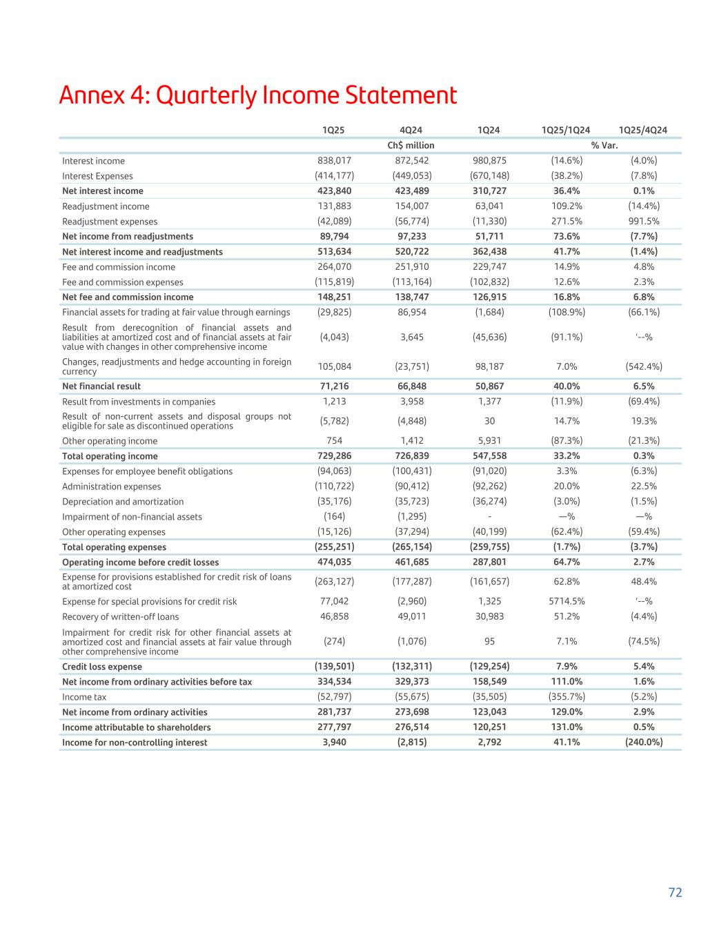 Annex 4: Quarterly Income Statement 1Q25 4Q24 1Q24 1Q25/1Q24 1Q25/4Q24   Ch$ million % Var. Interest income 838,017 872,542 980,875 (14.6%) (4.0%) Interest Expenses (414,177) (449,053) (670,148) (38.2%) (7.8%) Net interest income 423,840 423,489 310,727 36.4% 0.1% Readjustment income 131,883 154,007 63,041 109.2% (14.4%) Readjustment expenses (42,089) (56,774) (11,330) 271.5% 991.5% Net income from readjustments 89,794 97,233 51,711 73.6% (7.7%) Net interest income and readjustments 513,634 520,722 362,438 41.7% (1.4%) Fee and commission income 264,070 251,910 229,747 14.9% 4.8% Fee and commission expenses (115,819) (113,164) (102,832) 12.6% 2.3% Net fee and commission income 148,251 138,747 126,915 16.8% 6.8% Financial assets for trading at fair value through earnings (29,825) 86,954 (1,684) (108.9%) (66.1%) Result from derecognition of financial assets and liabilities at amortized cost and of financial assets at fair value with changes in other comprehensive income (4,043) 3,645 (45,636) (91.1%) ‘--% Changes, readjustments and hedge accounting in foreign currency 105,084 (23,751) 98,187 7.0% (542.4%) Net financial result 71,216 66,848 50,867 40.0% 6.5% Result from investments in companies 1,213 3,958 1,377 (11.9%) (69.4%) Result of non-current assets and disposal groups not eligible for sale as discontinued operations (5,782) (4,848) 30 14.7% 19.3% Other operating income 754 1,412 5,931 (87.3%) (21.3%) Total operating income 729,286 726,839 547,558 33.2% 0.3% Expenses for employee benefit obligations (94,063) (100,431) (91,020) 3.3% (6.3%) Administration expenses (110,722) (90,412) (92,262) 20.0% 22.5% Depreciation and amortization (35,176) (35,723) (36,274) (3.0%) (1.5%) Impairment of non-financial assets (164) (1,295) - —% —% Other operating expenses (15,126) (37,294) (40,199) (62.4%) (59.4%) Total operating expenses (255,251) (265,154) (259,755) (1.7%) (3.7%) Operating income before credit losses 474,035 461,685 287,801 64.7% 2.7% Expense for provisions established for credit risk of loans at amortized cost (263,127) (177,287) (161,657) 62.8% 48.4% Expense for special provisions for credit risk 77,042 (2,960) 1,325 5714.5% ‘--% Recovery of written-off loans 46,858 49,011 30,983 51.2% (4.4%) Impairment for credit risk for other financial assets at amortized cost and financial assets at fair value through other comprehensive income (274) (1,076) 95 7.1% (74.5%) Credit loss expense (139,501) (132,311) (129,254) 7.9% 5.4% Net income from ordinary activities before tax 334,534 329,373 158,549 111.0% 1.6% Income tax (52,797) (55,675) (35,505) (355.7%) (5.2%) Net income from ordinary activities 281,737 273,698 123,043 129.0% 2.9% Income attributable to shareholders 277,797 276,514 120,251 131.0% 0.5% Income for non-controlling interest 3,940 (2,815) 2,792 41.1% (240.0%) 72