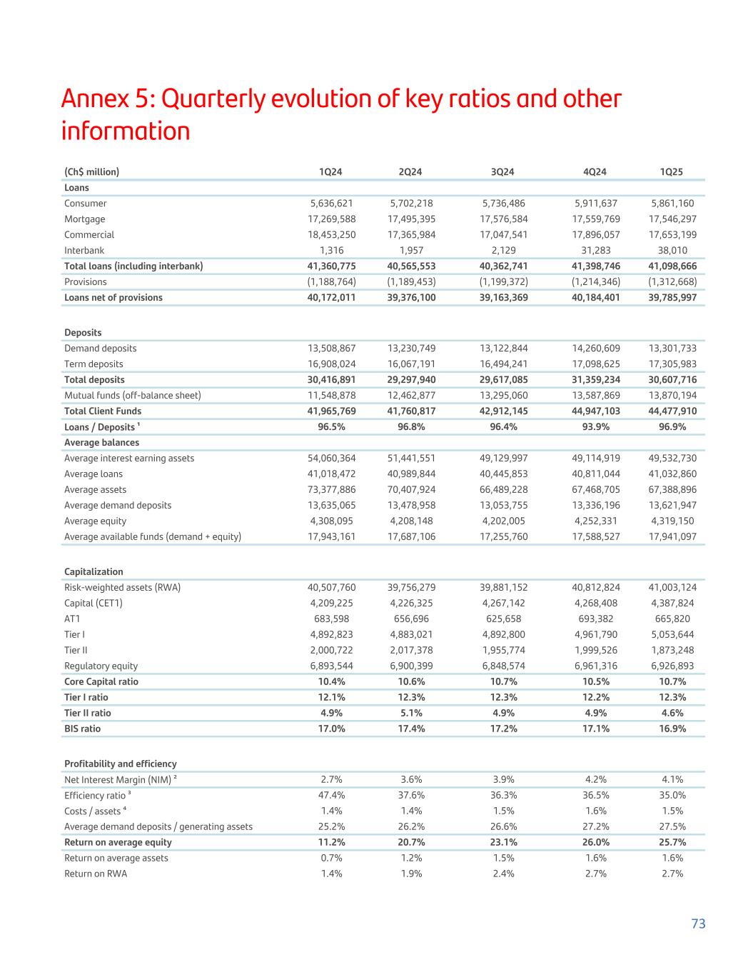 Annex 5: Quarterly evolution of key ratios and other information (Ch$ million) 1Q24 2Q24 3Q24 4Q24 1Q25 Loans Consumer 5,636,621 5,702,218 5,736,486 5,911,637 5,861,160 Mortgage 17,269,588 17,495,395 17,576,584 17,559,769 17,546,297 Commercial 18,453,250 17,365,984 17,047,541 17,896,057 17,653,199 Interbank 1,316 1,957 2,129 31,283 38,010 Total loans (including interbank) 41,360,775 40,565,553 40,362,741 41,398,746 41,098,666 Provisions (1,188,764) (1,189,453) (1,199,372) (1,214,346) (1,312,668) Loans net of provisions 40,172,011 39,376,100 39,163,369 40,184,401 39,785,997 Deposits Demand deposits 13,508,867 13,230,749 13,122,844 14,260,609 13,301,733 Term deposits 16,908,024 16,067,191 16,494,241 17,098,625 17,305,983 Total deposits 30,416,891 29,297,940 29,617,085 31,359,234 30,607,716 Mutual funds (off-balance sheet) 11,548,878 12,462,877 13,295,060 13,587,869 13,870,194 Total Client Funds 41,965,769 41,760,817 42,912,145 44,947,103 44,477,910 Loans / Deposits ¹ 96.5% 96.8% 96.4% 93.9% 96.9% Average balances Average interest earning assets 54,060,364 51,441,551 49,129,997 49,114,919 49,532,730 Average loans 41,018,472 40,989,844 40,445,853 40,811,044 41,032,860 Average assets 73,377,886 70,407,924 66,489,228 67,468,705 67,388,896 Average demand deposits 13,635,065 13,478,958 13,053,755 13,336,196 13,621,947 Average equity 4,308,095 4,208,148 4,202,005 4,252,331 4,319,150 Average available funds (demand + equity) 17,943,161 17,687,106 17,255,760 17,588,527 17,941,097 Capitalization Risk-weighted assets (RWA) 40,507,760 39,756,279 39,881,152 40,812,824 41,003,124 Capital (CET1) 4,209,225 4,226,325 4,267,142 4,268,408 4,387,824 AT1 683,598 656,696 625,658 693,382 665,820 Tier I 4,892,823 4,883,021 4,892,800 4,961,790 5,053,644 Tier II 2,000,722 2,017,378 1,955,774 1,999,526 1,873,248 Regulatory equity 6,893,544 6,900,399 6,848,574 6,961,316 6,926,893 Core Capital ratio 10.4% 10.6% 10.7% 10.5% 10.7% Tier I ratio 12.1% 12.3% 12.3% 12.2% 12.3% Tier II ratio 4.9% 5.1% 4.9% 4.9% 4.6% BIS ratio 17.0% 17.4% 17.2% 17.1% 16.9% Profitability and efficiency Net Interest Margin (NIM) ² 2.7% 3.6% 3.9% 4.2% 4.1% Efficiency ratio ³ 47.4% 37.6% 36.3% 36.5% 35.0% Costs / assets ⁴ 1.4% 1.4% 1.5% 1.6% 1.5% Average demand deposits / generating assets 25.2% 26.2% 26.6% 27.2% 27.5% Return on average equity 11.2% 20.7% 23.1% 26.0% 25.7% Return on average assets 0.7% 1.2% 1.5% 1.6% 1.6% Return on RWA 1.4% 1.9% 2.4% 2.7% 2.7% 73