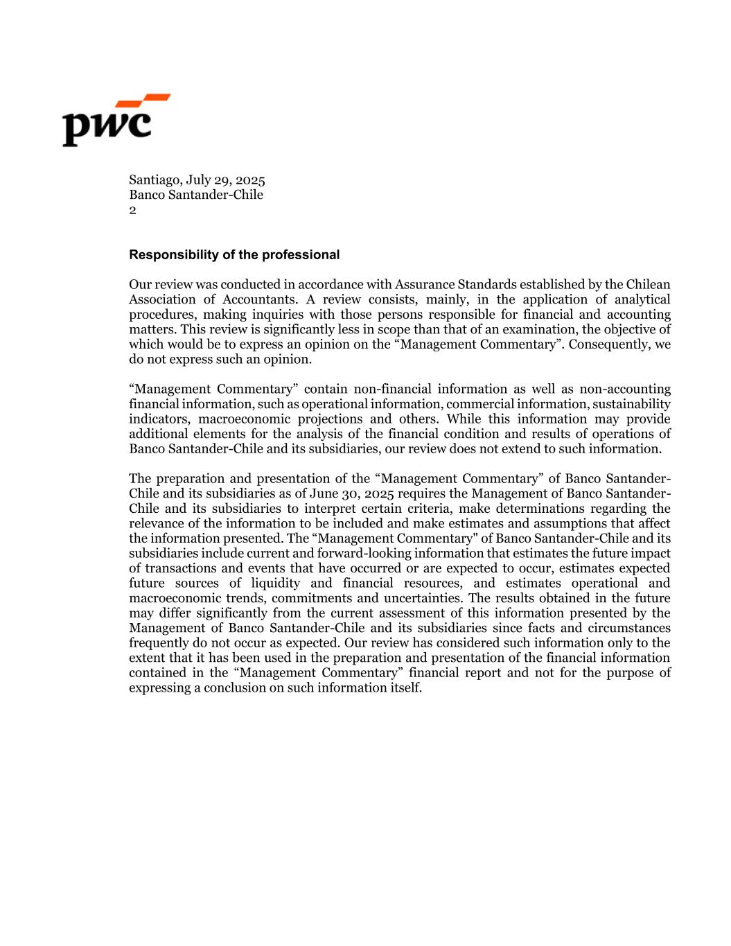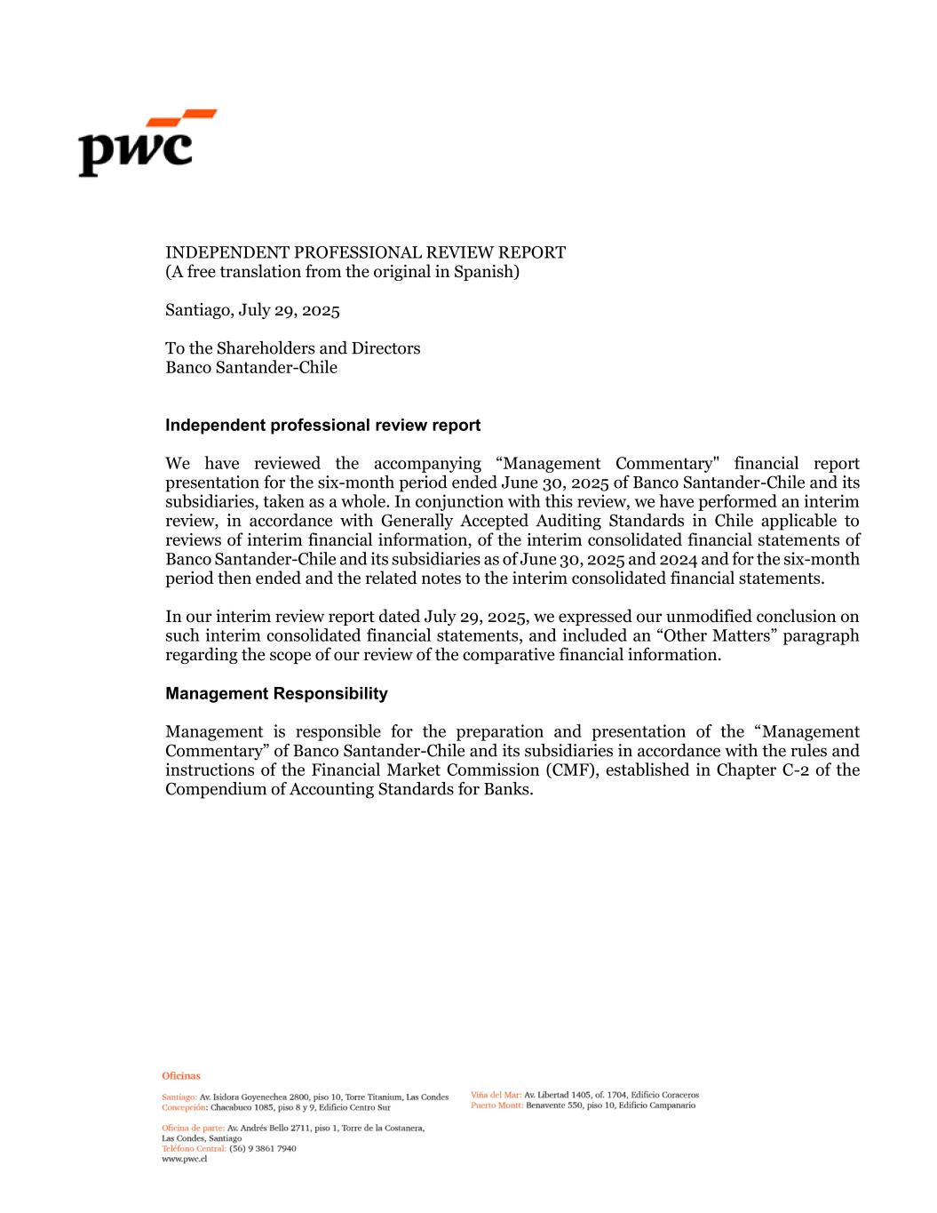 INDEPENDENT PROFESSIONAL REVIEW REPORT (A free translation from the original in Spanish) Santiago, July 29, 2025 To the Shareholders and Directors Banco Santander-Chile Independent professional review report We have reviewed the accompanying “Management Commentary" financial report presentation for the six-month period ended June 30, 2025 of Banco Santander-Chile and its subsidiaries, taken as a whole. In conjunction with this review, we have performed an interim review, in accordance with Generally Accepted Auditing Standards in Chile applicable to reviews of interim financial information, of the interim consolidated financial statements of Banco Santander-Chile and its subsidiaries as of June 30, 2025 and 2024 and for the six-month period then ended and the related notes to the interim consolidated financial statements. In our interim review report dated July 29, 2025, we expressed our unmodified conclusion on such interim consolidated financial statements, and included an “Other Matters” paragraph regarding the scope of our review of the comparative financial information. Management Responsibility Management is responsible for the preparation and presentation of the “Management Commentary” of Banco Santander-Chile and its subsidiaries in accordance with the rules and instructions of the Financial Market Commission (CMF), established in Chapter C-2 of the Compendium of Accounting Standards for Banks.