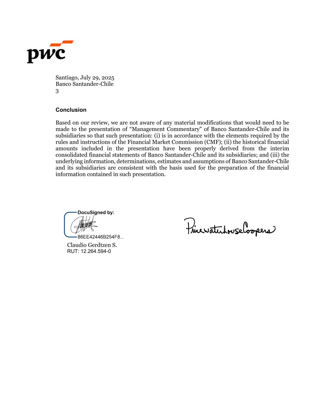 Santiago, July 29, 2025 Banco Santander-Chile 3 Conclusion Based on our review, we are not aware of any material modifications that would need to be made to the presentation of “Management Commentary" of Banco Santander-Chile and its subsidiaries so that such presentation: (i) is in accordance with the elements required by the rules and instructions of the Financial Market Commission (CMF); (ii) the historical financial amounts included in the presentation have been properly derived from the interim consolidated financial statements of Banco Santander-Chile and its subsidiaries; and (iii) the underlying information, determinations, estimates and assumptions of Banco Santander-Chile and its subsidiaries are consistent with the basis used for the preparation of the financial information contained in such presentation. Claudio Gerdtzen S. RUT: 12.264.594-0