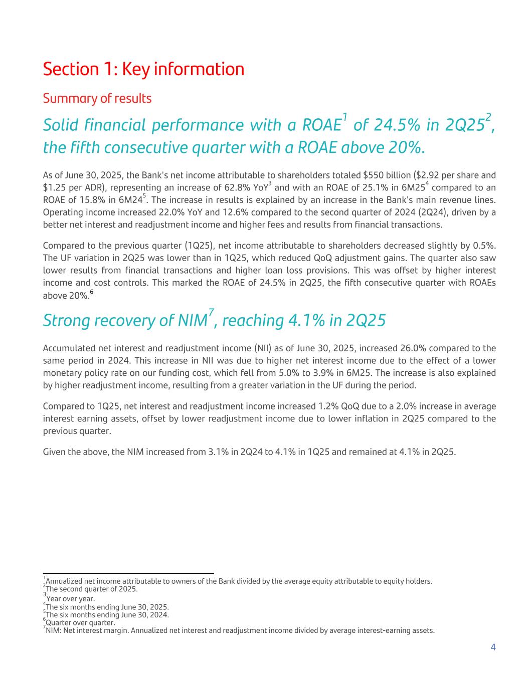 Section 1: Key information Summary of results Solid financial performance with a ROAE1 of 24.5% in 2Q252, the fifth consecutive quarter with a ROAE above 20%. As of June 30, 2025, the Bank's net income attributable to shareholders totaled $550 billion ($2.92 per share and $1.25 per ADR), representing an increase of 62.8% YoY3 and with an ROAE of 25.1% in 6M254 compared to an ROAE of 15.8% in 6M245. The increase in results is explained by an increase in the Bank's main revenue lines. Operating income increased 22.0% YoY and 12.6% compared to the second quarter of 2024 (2Q24), driven by a better net interest and readjustment income and higher fees and results from financial transactions. Compared to the previous quarter (1Q25), net income attributable to shareholders decreased slightly by 0.5%. The UF variation in 2Q25 was lower than in 1Q25, which reduced QoQ adjustment gains. The quarter also saw lower results from financial transactions and higher loan loss provisions. This was offset by higher interest income and cost controls. This marked the ROAE of 24.5% in 2Q25, the fifth consecutive quarter with ROAEs above 20%.6 Strong recovery of NIM7, reaching 4.1% in 2Q25 Accumulated net interest and readjustment income (NII) as of June 30, 2025, increased 26.0% compared to the same period in 2024. This increase in NII was due to higher net interest income due to the effect of a lower monetary policy rate on our funding cost, which fell from 5.0% to 3.9% in 6M25. The increase is also explained by higher readjustment income, resulting from a greater variation in the UF during the period. Compared to 1Q25, net interest and readjustment income increased 1.2% QoQ due to a 2.0% increase in average interest earning assets, offset by lower readjustment income due to lower inflation in 2Q25 compared to the previous quarter. Given the above, the NIM increased from 3.1% in 2Q24 to 4.1% in 1Q25 and remained at 4.1% in 2Q25. 4 1Annualized net income attributable to owners of the Bank divided by the average equity attributable to equity holders.2The second quarter of 2025. 3Year over year. 4The six months ending June 30, 2025.5The six months ending June 30, 2024.6Quarter over quarter.7NIM: Net interest margin. Annualized net interest and readjustment income divided by average interest-earning assets.
