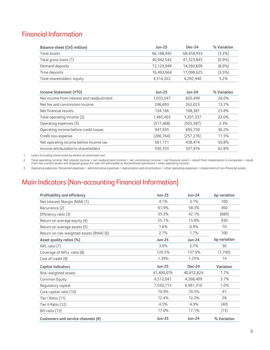 Financial Information Balance sheet (Ch$ million) Jun-25 Dec-24 % Variation Total assets 66,188,442 68,458,933 (3.3%) Total gross loans (1) 40,942,542 41,323,843 (0.9%) Demand deposits 13,120,949 14,260,609 (8.0%) Time deposits 16,493,664 17,098,625 (3.5%) Total shareholders' equity 4,514,322 4,292,440 5.2% Income Statement (YTD) Jun-25 Jun-24 % Variation Net income from interest and readjustment 1,033,547 820,449 26.0% Net fee and commission income 296,693 262,023 13.2% Net financial results 134,166 108,381 23.8% Total operating income (2) 1,465,403 1,201,337 22.0% Operating expenses (3) (517,468) (505,587) 2.3% Operating income before credit losses 947,935 695,750 36.2% Credit loss expense (286,764) (257,276) 11.5% Net operating income before income tax 661,171 438,474 50.8% Income attributable to shareholders 550,355 337,976 62.8% 1. Loans (including those owed by banks) at amortized cost. 2. Total operating income: Net interest income + net readjustment income + net commission income + net financial result + result from investments in companies + result from non-current assets and disposal groups for sale not admissible as discontinued operations + other operating income. 3. Operating expenses: Personnel expenses + administrative expenses + depreciation and amortization + other operating expenses + impairment of non-financial assets. Main Indicators (Non-accounting Financial Information) Profitability and efficiency Jun-25 Jun-24 bp variation Net Interest Margin (NIM) (1) 4.1% 3.1% 100 Recurrence (2) 61.9% 58.3% 360 Efficiency ratio (3) 35.3% 42.1% (680) Return on average equity (4) 25.1% 15.8% 930 Return on average assets (5) 1.6% 0.9% 70 Return on risk-weighted assets (RWA) (6) 2.7% 1.7% 100 Asset quality ratios (%) Jun-25 Jun-24 bp variation NPL ratio (7) 3.0% 2.7% 30 Coverage of NPLs ratio (8) 120.5% 137.9% (1,740) Cost of credit (9) 1.39% 1.25% 14 Capital indicators Jun-25 Dec-24 Variation Risk-weighted assets 41,490,076 40,812,824 1.7% Common Equity 4,512,041 4,268,409 5.7% Regulatory capital 7,030,713 6,961,316 1.0% Core capital ratio (10) 10.9% 10.5% 41 Tier I Ratio (11) 12.4% 12.2% 28 Tier II Ratio (12) 4.5% 4.9% (40) BIS ratio (13) 17.0% 17.1% (15) Customers and service channels (#) Jun-25 Jun-24 % Variation 6