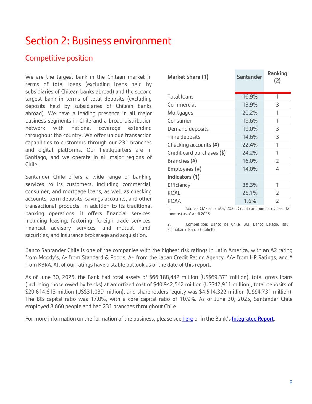 Section 2: Business environment Competitive position We are the largest bank in the Chilean market in terms of total loans (excluding loans held by subsidiaries of Chilean banks abroad) and the second largest bank in terms of total deposits (excluding deposits held by subsidiaries of Chilean banks abroad). We have a leading presence in all major business segments in Chile and a broad distribution network with national coverage extending throughout the country. We offer unique transaction capabilities to customers through our 231 branches and digital platforms. Our headquarters are in Santiago, and we operate in all major regions of Chile. Santander Chile offers a wide range of banking services to its customers, including commercial, consumer, and mortgage loans, as well as checking accounts, term deposits, savings accounts, and other transactional products. In addition to its traditional banking operations, it offers financial services, including leasing, factoring, foreign trade services, financial advisory services, and mutual fund, securities, and insurance brokerage and acquisition. Market Share (1) Santander Ranking (2) Total loans 16.9% 1 Commercial 13.9% 3 Mortgages 20.2% 1 Consumer 19.6% 1 Demand deposits 19.0% 3 Time deposits 14.6% 3 Checking accounts (#) 22.4% 1 Credit card purchases ($) 24.2% 1 Branches (#) 16.0% 2 Employees (#) 14.0% 4 Indicators (1) Efficiency 35.3% 1 ROAE 25.1% 2 ROAA 1.6% 2 1. Source: CMF as of May 2025. Credit card purchases (last 12 months) as of April 2025. 2. Competition: Banco de Chile, BCI, Banco Estado, Itaú, Scotiabank, Banco Falabella. Banco Santander Chile is one of the companies with the highest risk ratings in Latin America, with an A2 rating from Moody's, A- from Standard & Poor's, A+ from the Japan Credit Rating Agency, AA- from HR Ratings, and A from KBRA. All of our ratings have a stable outlook as of the date of this report. As of June 30, 2025, the Bank had total assets of $66,188,442 million (US$69,371 million), total gross loans (including those owed by banks) at amortized cost of $40,942,542 million (US$42,911 million), total deposits of $29,614,613 million (US$31,039 million), and shareholders' equity was $4,514,322 million (US$4,731 million). The BIS capital ratio was 17.0%, with a core capital ratio of 10.9%. As of June 30, 2025, Santander Chile employed 8,660 people and had 231 branches throughout Chile. For more information on the formation of the business, please see here or in the Bank's Integrated Report. 8