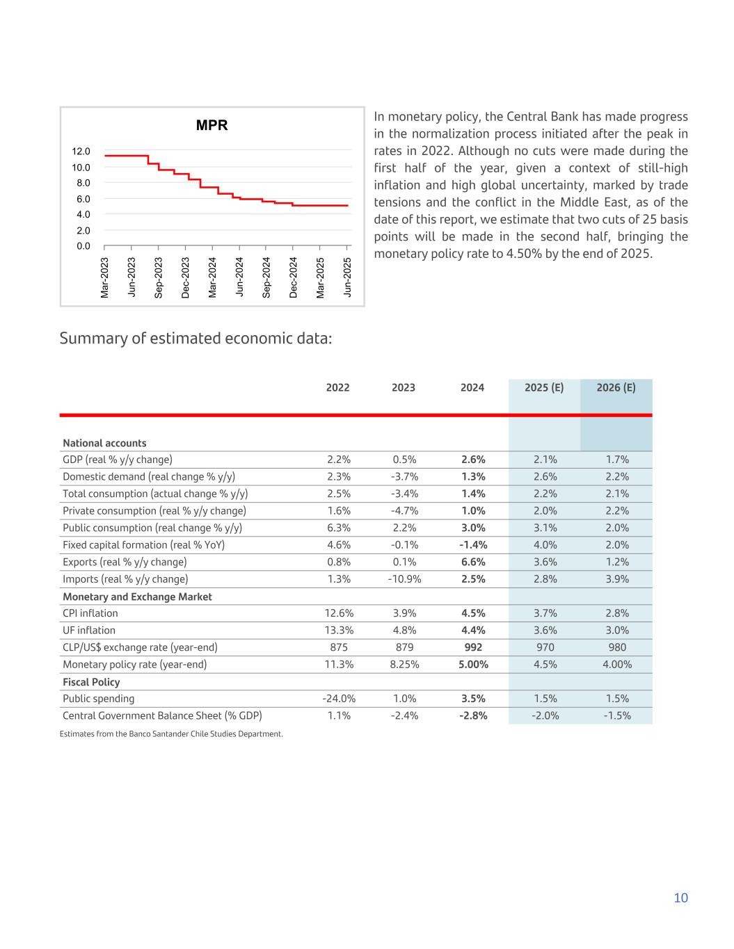 MPR M ar -2 02 3 Ju n- 20 23 S ep -2 02 3 D ec -2 02 3 M ar -2 02 4 Ju n- 20 24 S ep -2 02 4 D ec -2 02 4 M ar -2 02 5 Ju n- 20 25 0.0 2.0 4.0 6.0 8.0 10.0 12.0 In monetary policy, the Central Bank has made progress in the normalization process initiated after the peak in rates in 2022. Although no cuts were made during the first half of the year, given a context of still-high inflation and high global uncertainty, marked by trade tensions and the conflict in the Middle East, as of the date of this report, we estimate that two cuts of 25 basis points will be made in the second half, bringing the monetary policy rate to 4.50% by the end of 2025. Summary of estimated economic data: 2022 2023 2024 2025 (E) 2026 (E) National accounts GDP (real % y/y change) 2.2% 0.5% 2.6% 2.1% 1.7% Domestic demand (real change % y/y) 2.3% -3.7% 1.3% 2.6% 2.2% Total consumption (actual change % y/y) 2.5% -3.4% 1.4% 2.2% 2.1% Private consumption (real % y/y change) 1.6% -4.7% 1.0% 2.0% 2.2% Public consumption (real change % y/y) 6.3% 2.2% 3.0% 3.1% 2.0% Fixed capital formation (real % YoY) 4.6% -0.1% -1.4% 4.0% 2.0% Exports (real % y/y change) 0.8% 0.1% 6.6% 3.6% 1.2% Imports (real % y/y change) 1.3% -10.9% 2.5% 2.8% 3.9% Monetary and Exchange Market CPI inflation 12.6% 3.9% 4.5% 3.7% 2.8% UF inflation 13.3% 4.8% 4.4% 3.6% 3.0% CLP/US$ exchange rate (year-end) 875 879 992 970 980 Monetary policy rate (year-end) 11.3% 8.25% 5.00% 4.5% 4.00% Fiscal Policy Public spending -24.0% 1.0% 3.5% 1.5% 1.5% Central Government Balance Sheet (% GDP) 1.1% -2.4% -2.8% -2.0% -1.5% Estimates from the Banco Santander Chile Studies Department. 10
