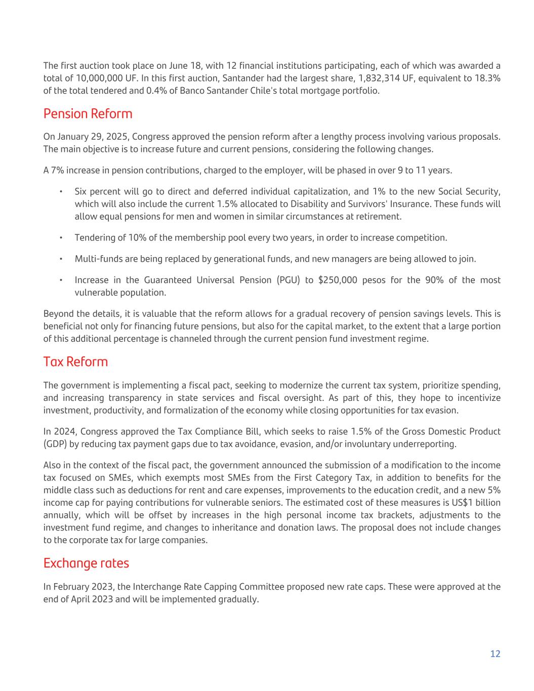 The first auction took place on June 18, with 12 financial institutions participating, each of which was awarded a total of 10,000,000 UF. In this first auction, Santander had the largest share, 1,832,314 UF, equivalent to 18.3% of the total tendered and 0.4% of Banco Santander Chile's total mortgage portfolio. Pension Reform On January 29, 2025, Congress approved the pension reform after a lengthy process involving various proposals. The main objective is to increase future and current pensions, considering the following changes. A 7% increase in pension contributions, charged to the employer, will be phased in over 9 to 11 years. • Six percent will go to direct and deferred individual capitalization, and 1% to the new Social Security, which will also include the current 1.5% allocated to Disability and Survivors' Insurance. These funds will allow equal pensions for men and women in similar circumstances at retirement. • Tendering of 10% of the membership pool every two years, in order to increase competition. • Multi-funds are being replaced by generational funds, and new managers are being allowed to join. • Increase in the Guaranteed Universal Pension (PGU) to $250,000 pesos for the 90% of the most vulnerable population. Beyond the details, it is valuable that the reform allows for a gradual recovery of pension savings levels. This is beneficial not only for financing future pensions, but also for the capital market, to the extent that a large portion of this additional percentage is channeled through the current pension fund investment regime. Tax Reform The government is implementing a fiscal pact, seeking to modernize the current tax system, prioritize spending, and increasing transparency in state services and fiscal oversight. As part of this, they hope to incentivize investment, productivity, and formalization of the economy while closing opportunities for tax evasion. In 2024, Congress approved the Tax Compliance Bill, which seeks to raise 1.5% of the Gross Domestic Product (GDP) by reducing tax payment gaps due to tax avoidance, evasion, and/or involuntary underreporting. Also in the context of the fiscal pact, the government announced the submission of a modification to the income tax focused on SMEs, which exempts most SMEs from the First Category Tax, in addition to benefits for the middle class such as deductions for rent and care expenses, improvements to the education credit, and a new 5% income cap for paying contributions for vulnerable seniors. The estimated cost of these measures is US$1 billion annually, which will be offset by increases in the high personal income tax brackets, adjustments to the investment fund regime, and changes to inheritance and donation laws. The proposal does not include changes to the corporate tax for large companies. Exchange rates In February 2023, the Interchange Rate Capping Committee proposed new rate caps. These were approved at the end of April 2023 and will be implemented gradually. 12