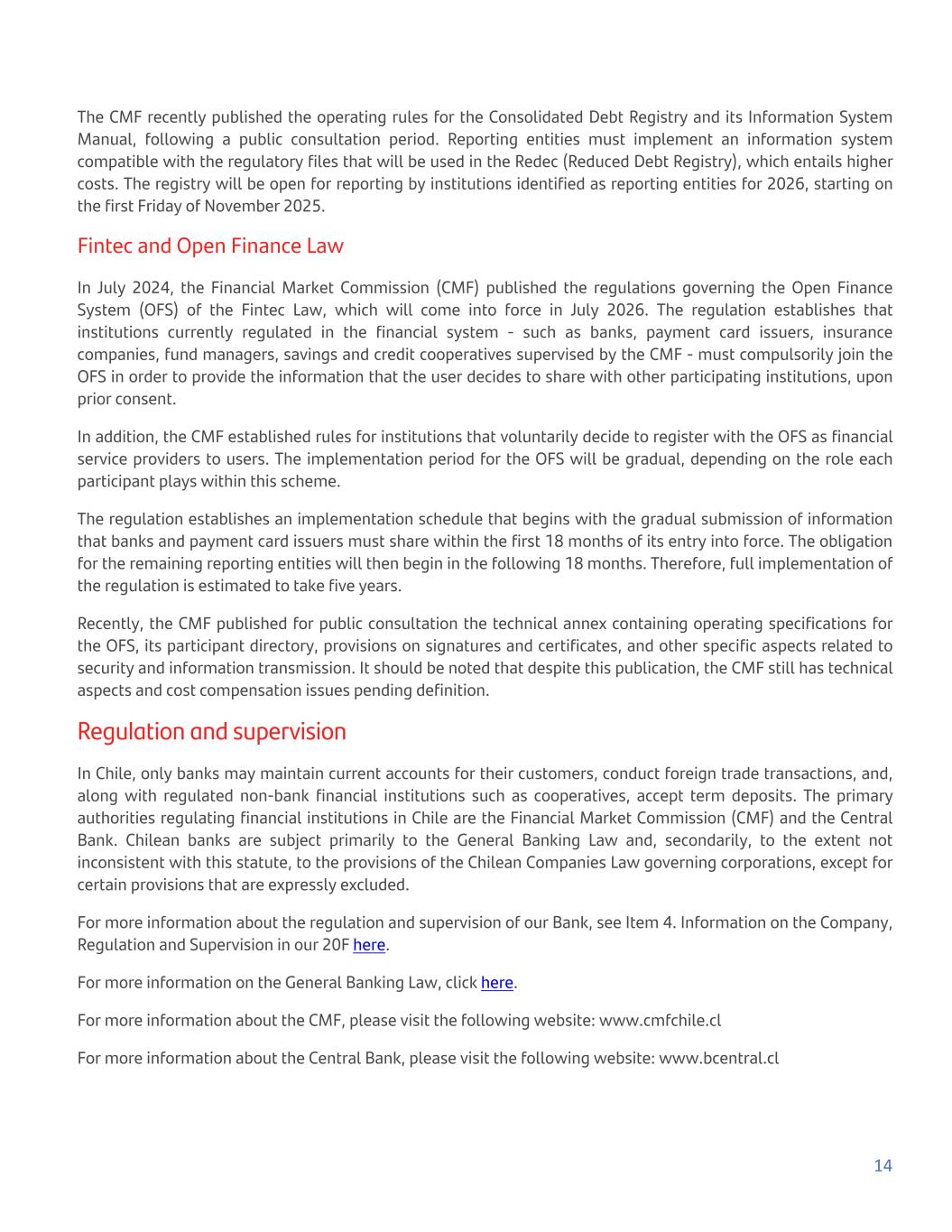 The CMF recently published the operating rules for the Consolidated Debt Registry and its Information System Manual, following a public consultation period. Reporting entities must implement an information system compatible with the regulatory files that will be used in the Redec (Reduced Debt Registry), which entails higher costs. The registry will be open for reporting by institutions identified as reporting entities for 2026, starting on the first Friday of November 2025. Fintec and Open Finance Law In July 2024, the Financial Market Commission (CMF) published the regulations governing the Open Finance System (OFS) of the Fintec Law, which will come into force in July 2026. The regulation establishes that institutions currently regulated in the financial system - such as banks, payment card issuers, insurance companies, fund managers, savings and credit cooperatives supervised by the CMF - must compulsorily join the OFS in order to provide the information that the user decides to share with other participating institutions, upon prior consent. In addition, the CMF established rules for institutions that voluntarily decide to register with the OFS as financial service providers to users. The implementation period for the OFS will be gradual, depending on the role each participant plays within this scheme. The regulation establishes an implementation schedule that begins with the gradual submission of information that banks and payment card issuers must share within the first 18 months of its entry into force. The obligation for the remaining reporting entities will then begin in the following 18 months. Therefore, full implementation of the regulation is estimated to take five years. Recently, the CMF published for public consultation the technical annex containing operating specifications for the OFS, its participant directory, provisions on signatures and certificates, and other specific aspects related to security and information transmission. It should be noted that despite this publication, the CMF still has technical aspects and cost compensation issues pending definition. Regulation and supervision In Chile, only banks may maintain current accounts for their customers, conduct foreign trade transactions, and, along with regulated non-bank financial institutions such as cooperatives, accept term deposits. The primary authorities regulating financial institutions in Chile are the Financial Market Commission (CMF) and the Central Bank. Chilean banks are subject primarily to the General Banking Law and, secondarily, to the extent not inconsistent with this statute, to the provisions of the Chilean Companies Law governing corporations, except for certain provisions that are expressly excluded. For more information about the regulation and supervision of our Bank, see Item 4. Information on the Company, Regulation and Supervision in our 20F here. For more information on the General Banking Law, click here. For more information about the CMF, please visit the following website: www.cmfchile.cl For more information about the Central Bank, please visit the following website: www.bcentral.cl 14