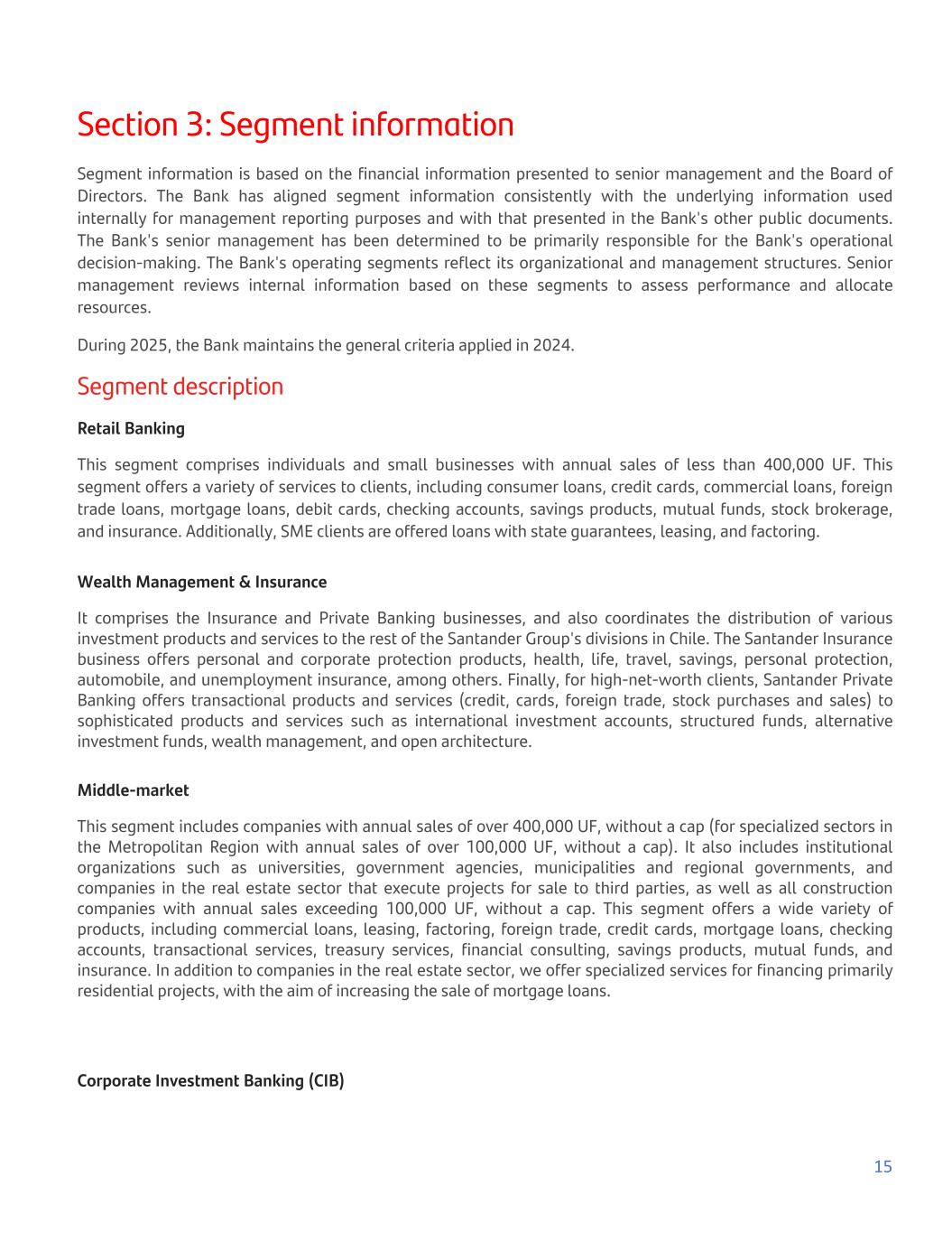 Section 3: Segment information Segment information is based on the financial information presented to senior management and the Board of Directors. The Bank has aligned segment information consistently with the underlying information used internally for management reporting purposes and with that presented in the Bank's other public documents. The Bank's senior management has been determined to be primarily responsible for the Bank's operational decision-making. The Bank's operating segments reflect its organizational and management structures. Senior management reviews internal information based on these segments to assess performance and allocate resources. During 2025, the Bank maintains the general criteria applied in 2024. Segment description Retail Banking This segment comprises individuals and small businesses with annual sales of less than 400,000 UF. This segment offers a variety of services to clients, including consumer loans, credit cards, commercial loans, foreign trade loans, mortgage loans, debit cards, checking accounts, savings products, mutual funds, stock brokerage, and insurance. Additionally, SME clients are offered loans with state guarantees, leasing, and factoring. Wealth Management & Insurance It comprises the Insurance and Private Banking businesses, and also coordinates the distribution of various investment products and services to the rest of the Santander Group's divisions in Chile. The Santander Insurance business offers personal and corporate protection products, health, life, travel, savings, personal protection, automobile, and unemployment insurance, among others. Finally, for high-net-worth clients, Santander Private Banking offers transactional products and services (credit, cards, foreign trade, stock purchases and sales) to sophisticated products and services such as international investment accounts, structured funds, alternative investment funds, wealth management, and open architecture. Middle-market This segment includes companies with annual sales of over 400,000 UF, without a cap (for specialized sectors in the Metropolitan Region with annual sales of over 100,000 UF, without a cap). It also includes institutional organizations such as universities, government agencies, municipalities and regional governments, and companies in the real estate sector that execute projects for sale to third parties, as well as all construction companies with annual sales exceeding 100,000 UF, without a cap. This segment offers a wide variety of products, including commercial loans, leasing, factoring, foreign trade, credit cards, mortgage loans, checking accounts, transactional services, treasury services, financial consulting, savings products, mutual funds, and insurance. In addition to companies in the real estate sector, we offer specialized services for financing primarily residential projects, with the aim of increasing the sale of mortgage loans. Corporate Investment Banking (CIB) 15