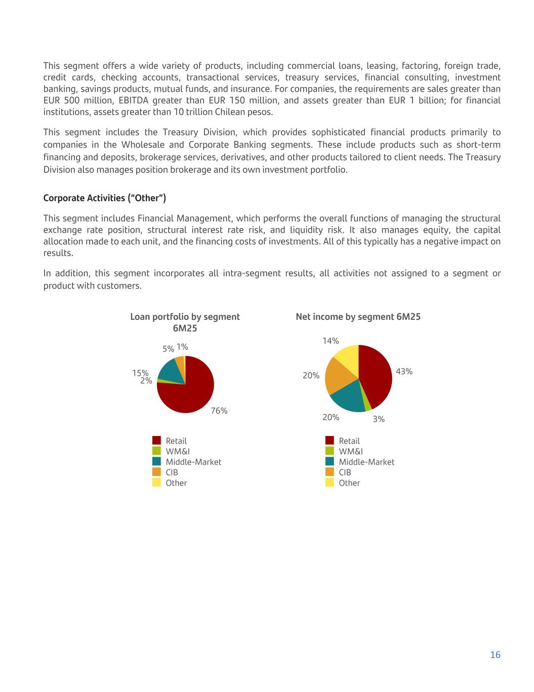 This segment offers a wide variety of products, including commercial loans, leasing, factoring, foreign trade, credit cards, checking accounts, transactional services, treasury services, financial consulting, investment banking, savings products, mutual funds, and insurance. For companies, the requirements are sales greater than EUR 500 million, EBITDA greater than EUR 150 million, and assets greater than EUR 1 billion; for financial institutions, assets greater than 10 trillion Chilean pesos. This segment includes the Treasury Division, which provides sophisticated financial products primarily to companies in the Wholesale and Corporate Banking segments. These include products such as short-term financing and deposits, brokerage services, derivatives, and other products tailored to client needs. The Treasury Division also manages position brokerage and its own investment portfolio. Corporate Activities (“Other”) This segment includes Financial Management, which performs the overall functions of managing the structural exchange rate position, structural interest rate risk, and liquidity risk. It also manages equity, the capital allocation made to each unit, and the financing costs of investments. All of this typically has a negative impact on results. In addition, this segment incorporates all intra-segment results, all activities not assigned to a segment or product with customers. Loan portfolio by segment 6M25 76% 2% 15% 5% 1% Retail WM&I Middle-Market CIB Other Net income by segment 6M25 43% 3%20% 20% 14% Retail WM&I Middle-Market CIB Other 16
