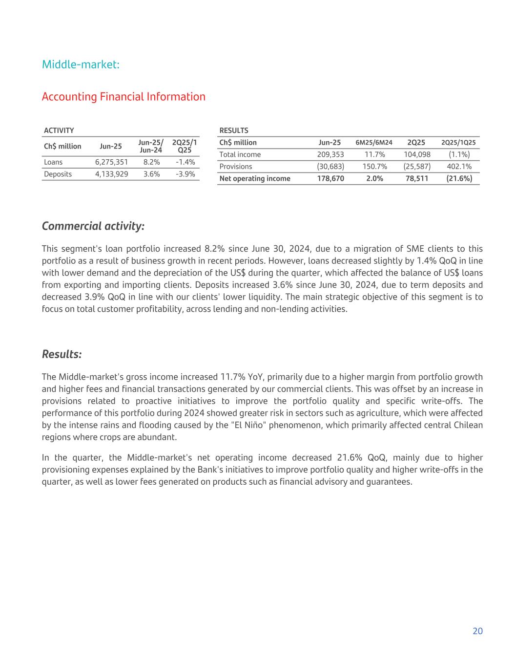 Middle-market: Accounting Financial Information ACTIVITY Ch$ million Jun-25 Jun-25/ Jun-24 2Q25/1 Q25 Loans 6,275,351 8.2% -1.4% Deposits 4,133,929 3.6% -3.9% RESULTS Ch$ million Jun-25 6M25/6M24 2Q25 2Q25/1Q25 Total income 209,353 11.7% 104,098 (1.1%) Provisions (30,683) 150.7% (25,587) 402.1% Net operating income 178,670 2.0% 78,511 (21.6%) Commercial activity: This segment's loan portfolio increased 8.2% since June 30, 2024, due to a migration of SME clients to this portfolio as a result of business growth in recent periods. However, loans decreased slightly by 1.4% QoQ in line with lower demand and the depreciation of the US$ during the quarter, which affected the balance of US$ loans from exporting and importing clients. Deposits increased 3.6% since June 30, 2024, due to term deposits and decreased 3.9% QoQ in line with our clients' lower liquidity. The main strategic objective of this segment is to focus on total customer profitability, across lending and non-lending activities. Results: The Middle-market's gross income increased 11.7% YoY, primarily due to a higher margin from portfolio growth and higher fees and financial transactions generated by our commercial clients. This was offset by an increase in provisions related to proactive initiatives to improve the portfolio quality and specific write-offs. The performance of this portfolio during 2024 showed greater risk in sectors such as agriculture, which were affected by the intense rains and flooding caused by the "El Niño" phenomenon, which primarily affected central Chilean regions where crops are abundant. In the quarter, the Middle-market's net operating income decreased 21.6% QoQ, mainly due to higher provisioning expenses explained by the Bank's initiatives to improve portfolio quality and higher write-offs in the quarter, as well as lower fees generated on products such as financial advisory and guarantees. 20