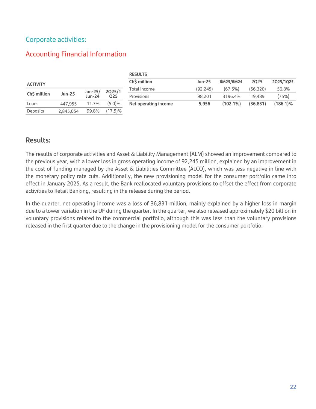 Corporate activities: Accounting Financial Information ACTIVITY Ch$ million Jun-25 Jun-25/ Jun-24 2Q25/1 Q25 Loans 447,955 11.7% (5.0)% Deposits 2,845,054 99.8% (17.5)% RESULTS Ch$ million Jun-25 6M25/6M24 2Q25 2Q25/1Q25 Total income (92,245) (67.5%) (56,320) 56.8% Provisions 98,201 3196.4% 19,489 (75%) Net operating income 5,956 (102.1%) (36,831) (186.1)% Results: The results of corporate activities and Asset & Liability Management (ALM) showed an improvement compared to the previous year, with a lower loss in gross operating income of 92,245 million, explained by an improvement in the cost of funding managed by the Asset & Liabilities Committee (ALCO), which was less negative in line with the monetary policy rate cuts. Additionally, the new provisioning model for the consumer portfolio came into effect in January 2025. As a result, the Bank reallocated voluntary provisions to offset the effect from corporate activities to Retail Banking, resulting in the release during the period. In the quarter, net operating income was a loss of 36,831 million, mainly explained by a higher loss in margin due to a lower variation in the UF during the quarter. In the quarter, we also released approximately $20 billion in voluntary provisions related to the commercial portfolio, although this was less than the voluntary provisions released in the first quarter due to the change in the provisioning model for the consumer portfolio. 22