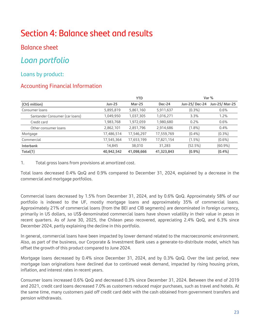 Section 4: Balance sheet and results Balance sheet Loan portfolio Loans by product: Accounting Financial Information YTD Var % (Ch$ million) Jun-25 Mar-25 Dec-24 Jun-25/ Dec-24 Jun-25/ Mar-25 Consumer loans 5,895,819 5,861,160 5,911,637 (0.3%) 0.6% Santander Consumer (car loans) 1,049,950 1,037,305 1,016,271 3.3% 1.2% Credit card 1,983,768 1,972,059 1,980,680 0.2% 0.6% Other consumer loans 2,862,101 2,851,796 2,914,686 (1.8%) 0.4% Mortgage 17,486,514 17,546,297 17,559,769 (0.4%) (0.3%) Commercial 17,545,364 17,653,199 17,821,154 (1.5%) (0.6%) Interbank 14,845 38,010 31,283 (52.5%) (60.9%) Total(1) 40,942,542 41,098,666 41,323,843 (0.9%) (0.4%) 1. Total gross loans from provisions at amortized cost. Total loans decreased 0.4% QoQ and 0.9% compared to December 31, 2024, explained by a decrease in the commercial and mortgage portfolios. Commercial loans decreased by 1.5% from December 31, 2024, and by 0.6% QoQ. Approximately 58% of our portfolio is indexed to the UF, mostly mortgage loans and approximately 35% of commercial loans. Approximately 21% of commercial loans (from the BEI and CIB segments) are denominated in foreign currency, primarily in US dollars, so US$-denominated commercial loans have shown volatility in their value in pesos in recent quarters. As of June 30, 2025, the Chilean peso recovered, appreciating 2.4% QoQ, and 6.3% since December 2024, partly explaining the decline in this portfolio. In general, commercial loans have been impacted by lower demand related to the macroeconomic environment. Also, as part of the business, our Corporate & Investment Bank uses a generate-to-distribute model, which has offset the growth of this product compared to June 2024. Mortgage loans decreased by 0.4% since December 31, 2024, and by 0.3% QoQ. Over the last period, new mortgage loan originations have declined due to continued weak demand, impacted by rising housing prices, inflation, and interest rates in recent years. Consumer loans increased 0.6% QoQ and decreased 0.3% since December 31, 2024. Between the end of 2019 and 2021, credit card loans decreased 7.0% as customers reduced major purchases, such as travel and hotels. At the same time, many customers paid off credit card debt with the cash obtained from government transfers and pension withdrawals. 23