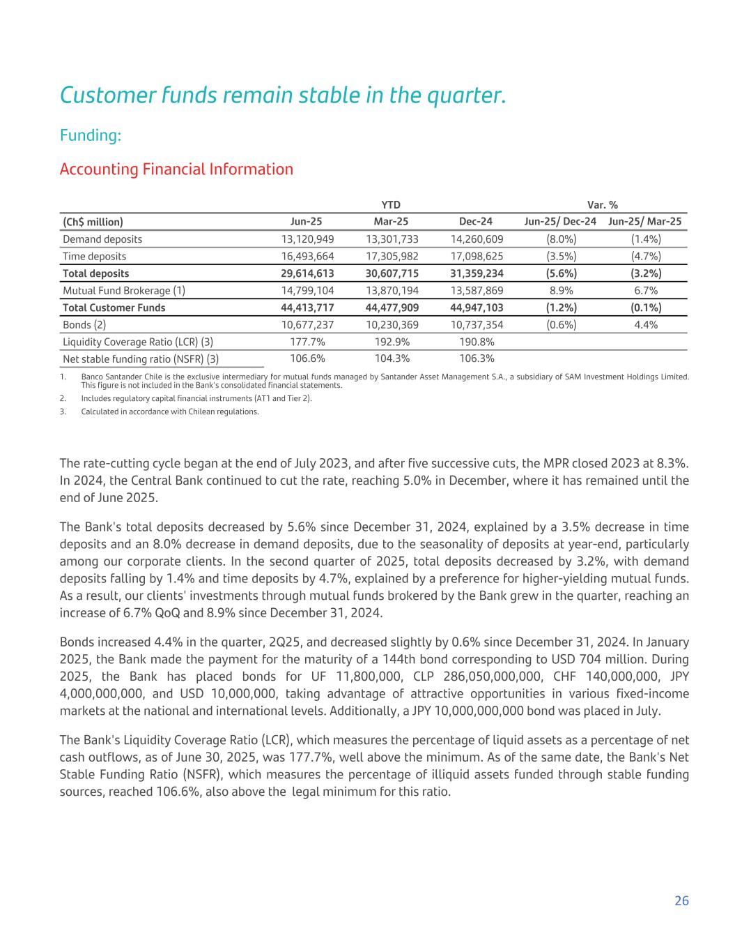 Customer funds remain stable in the quarter. Funding: Accounting Financial Information YTD Var. % (Ch$ million) Jun-25 Mar-25 Dec-24 Jun-25/ Dec-24 Jun-25/ Mar-25 Demand deposits 13,120,949 13,301,733 14,260,609 (8.0%) (1.4%) Time deposits 16,493,664 17,305,982 17,098,625 (3.5%) (4.7%) Total deposits 29,614,613 30,607,715 31,359,234 (5.6%) (3.2%) Mutual Fund Brokerage (1) 14,799,104 13,870,194 13,587,869 8.9% 6.7% Total Customer Funds 44,413,717 44,477,909 44,947,103 (1.2%) (0.1%) Bonds (2) 10,677,237 10,230,369 10,737,354 (0.6%) 4.4% Liquidity Coverage Ratio (LCR) (3) 177.7% 192.9% 190.8% Net stable funding ratio (NSFR) (3) 106.6% 104.3% 106.3% 1. Banco Santander Chile is the exclusive intermediary for mutual funds managed by Santander Asset Management S.A., a subsidiary of SAM Investment Holdings Limited. This figure is not included in the Bank's consolidated financial statements. 2. Includes regulatory capital financial instruments (AT1 and Tier 2). 3. Calculated in accordance with Chilean regulations. The rate-cutting cycle began at the end of July 2023, and after five successive cuts, the MPR closed 2023 at 8.3%. In 2024, the Central Bank continued to cut the rate, reaching 5.0% in December, where it has remained until the end of June 2025. The Bank's total deposits decreased by 5.6% since December 31, 2024, explained by a 3.5% decrease in time deposits and an 8.0% decrease in demand deposits, due to the seasonality of deposits at year-end, particularly among our corporate clients. In the second quarter of 2025, total deposits decreased by 3.2%, with demand deposits falling by 1.4% and time deposits by 4.7%, explained by a preference for higher-yielding mutual funds. As a result, our clients' investments through mutual funds brokered by the Bank grew in the quarter, reaching an increase of 6.7% QoQ and 8.9% since December 31, 2024. Bonds increased 4.4% in the quarter, 2Q25, and decreased slightly by 0.6% since December 31, 2024. In January 2025, the Bank made the payment for the maturity of a 144th bond corresponding to USD 704 million. During 2025, the Bank has placed bonds for UF 11,800,000, CLP 286,050,000,000, CHF 140,000,000, JPY 4,000,000,000, and USD 10,000,000, taking advantage of attractive opportunities in various fixed-income markets at the national and international levels. Additionally, a JPY 10,000,000,000 bond was placed in July. The Bank's Liquidity Coverage Ratio (LCR), which measures the percentage of liquid assets as a percentage of net cash outflows, as of June 30, 2025, was 177.7%, well above the minimum. As of the same date, the Bank's Net Stable Funding Ratio (NSFR), which measures the percentage of illiquid assets funded through stable funding sources, reached 106.6%, also above the legal minimum for this ratio. 26