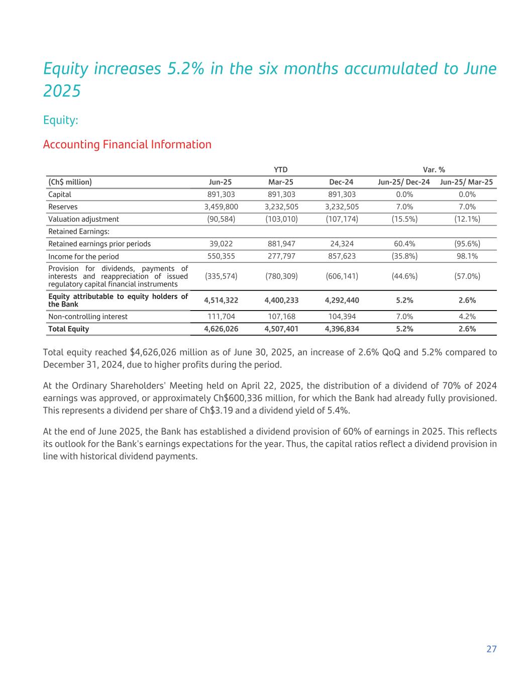 Equity increases 5.2% in the six months accumulated to June 2025 Equity: Accounting Financial Information YTD Var. % (Ch$ million) Jun-25 Mar-25 Dec-24 Jun-25/ Dec-24 Jun-25/ Mar-25 Capital 891,303 891,303 891,303 0.0% 0.0% Reserves 3,459,800 3,232,505 3,232,505 7.0% 7.0% Valuation adjustment (90,584) (103,010) (107,174) (15.5%) (12.1%) Retained Earnings: Retained earnings prior periods 39,022 881,947 24,324 60.4% (95.6%) Income for the period 550,355 277,797 857,623 (35.8%) 98.1% Provision for dividends, payments of interests and reappreciation of issued regulatory capital financial instruments (335,574) (780,309) (606,141) (44.6%) (57.0%) Equity attributable to equity holders of the Bank 4,514,322 4,400,233 4,292,440 5.2% 2.6% Non-controlling interest 111,704 107,168 104,394 7.0% 4.2% Total Equity 4,626,026 4,507,401 4,396,834 5.2% 2.6% Total equity reached $4,626,026 million as of June 30, 2025, an increase of 2.6% QoQ and 5.2% compared to December 31, 2024, due to higher profits during the period. At the Ordinary Shareholders' Meeting held on April 22, 2025, the distribution of a dividend of 70% of 2024 earnings was approved, or approximately Ch$600,336 million, for which the Bank had already fully provisioned. This represents a dividend per share of Ch$3.19 and a dividend yield of 5.4%. At the end of June 2025, the Bank has established a dividend provision of 60% of earnings in 2025. This reflects its outlook for the Bank's earnings expectations for the year. Thus, the capital ratios reflect a dividend provision in line with historical dividend payments. 27