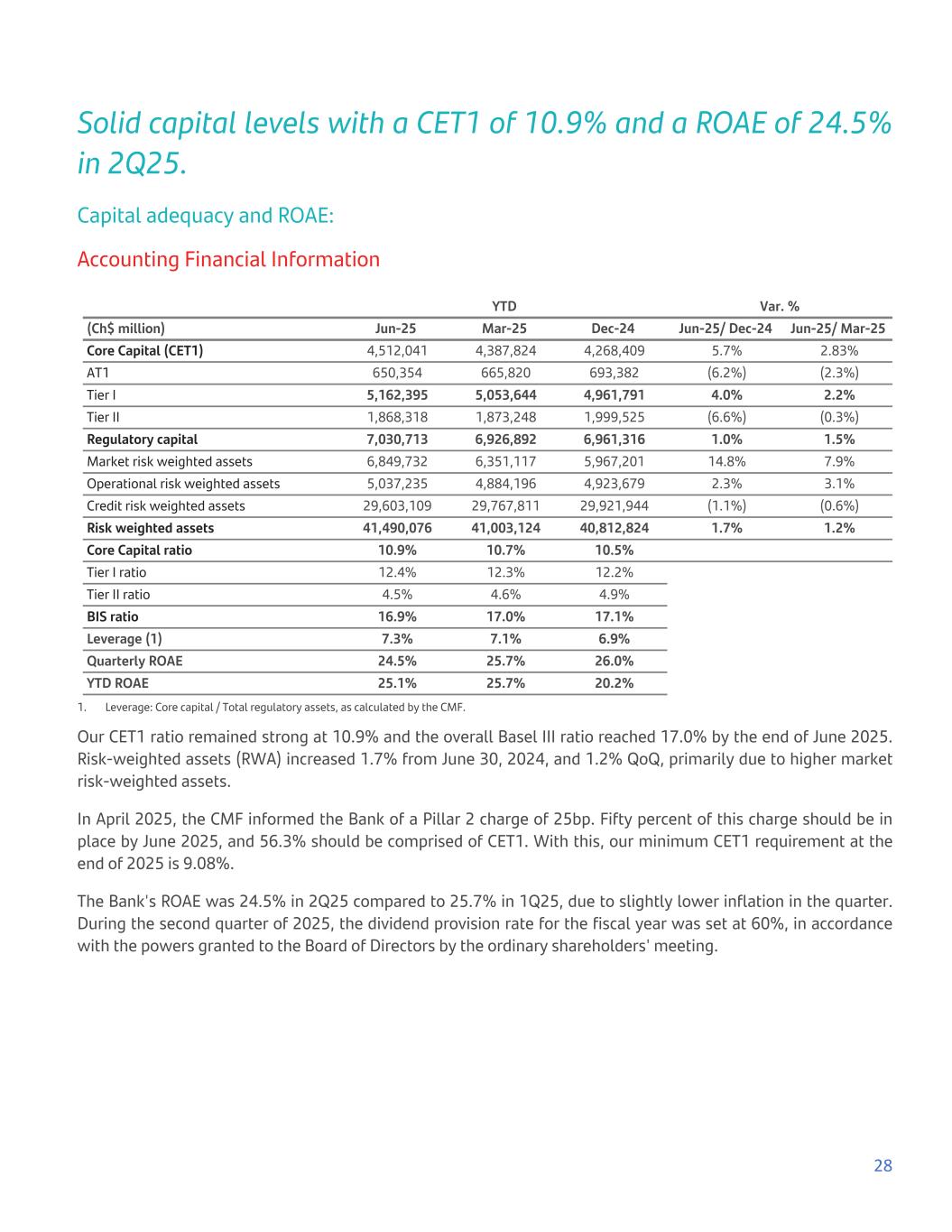 Solid capital levels with a CET1 of 10.9% and a ROAE of 24.5% in 2Q25. Capital adequacy and ROAE: Accounting Financial Information YTD Var. % (Ch$ million) Jun-25 Mar-25 Dec-24 Jun-25/ Dec-24 Jun-25/ Mar-25 Core Capital (CET1) 4,512,041 4,387,824 4,268,409 5.7% 2.83% AT1 650,354 665,820 693,382 (6.2%) (2.3%) Tier I 5,162,395 5,053,644 4,961,791 4.0% 2.2% Tier II 1,868,318 1,873,248 1,999,525 (6.6%) (0.3%) Regulatory capital 7,030,713 6,926,892 6,961,316 1.0% 1.5% Market risk weighted assets 6,849,732 6,351,117 5,967,201 14.8% 7.9% Operational risk weighted assets 5,037,235 4,884,196 4,923,679 2.3% 3.1% Credit risk weighted assets 29,603,109 29,767,811 29,921,944 (1.1%) (0.6%) Risk weighted assets 41,490,076 41,003,124 40,812,824 1.7% 1.2% Core Capital ratio 10.9% 10.7% 10.5% Tier I ratio 12.4% 12.3% 12.2% Tier II ratio 4.5% 4.6% 4.9% BIS ratio 16.9% 17.0% 17.1% Leverage (1) 7.3% 7.1% 6.9% Quarterly ROAE 24.5% 25.7% 26.0% YTD ROAE 25.1% 25.7% 20.2% 1. Leverage: Core capital / Total regulatory assets, as calculated by the CMF. Our CET1 ratio remained strong at 10.9% and the overall Basel III ratio reached 17.0% by the end of June 2025. Risk-weighted assets (RWA) increased 1.7% from June 30, 2024, and 1.2% QoQ, primarily due to higher market risk-weighted assets. In April 2025, the CMF informed the Bank of a Pillar 2 charge of 25bp. Fifty percent of this charge should be in place by June 2025, and 56.3% should be comprised of CET1. With this, our minimum CET1 requirement at the end of 2025 is 9.08%. The Bank's ROAE was 24.5% in 2Q25 compared to 25.7% in 1Q25, due to slightly lower inflation in the quarter. During the second quarter of 2025, the dividend provision rate for the fiscal year was set at 60%, in accordance with the powers granted to the Board of Directors by the ordinary shareholders' meeting. 28