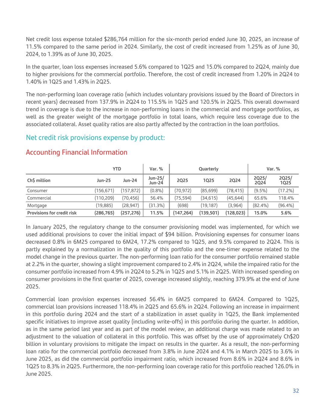 Net credit loss expense totaled $286,764 million for the six-month period ended June 30, 2025, an increase of 11.5% compared to the same period in 2024. Similarly, the cost of credit increased from 1.25% as of June 30, 2024, to 1.39% as of June 30, 2025. In the quarter, loan loss expenses increased 5.6% compared to 1Q25 and 15.0% compared to 2Q24, mainly due to higher provisions for the commercial portfolio. Therefore, the cost of credit increased from 1.20% in 2Q24 to 1.40% in 1Q25 and 1.43% in 2Q25. The non-performing loan coverage ratio (which includes voluntary provisions issued by the Board of Directors in recent years) decreased from 137.9% in 2Q24 to 115.5% in 1Q25 and 120.5% in 2Q25. This overall downward trend in coverage is due to the increase in non-performing loans in the commercial and mortgage portfolios, as well as the greater weight of the mortgage portfolio in total loans, which require less coverage due to the associated collateral. Asset quality ratios are also partly affected by the contraction in the loan portfolios. Net credit risk provisions expense by product: Accounting Financial Information YTD Var. % Quarterly Var. % Ch$ million Jun-25 Jun-24 Jun-25/ Jun-24 2Q25 1Q25 2Q24 2Q25/ 2Q24 2Q25/ 1Q25 Consumer (156,671) (157,872) (0.8%) (70,972) (85,699) (78,415) (9.5%) (17.2%) Commercial (110,209) (70,456) 56.4% (75,594) (34,615) (45,644) 65.6% 118.4% Mortgage (19,885) (28,947) (31.3%) (698) (19,187) (3,964) (82.4%) (96.4%) Provisions for credit risk (286,765) (257,276) 11.5% (147,264) (139,501) (128,023) 15.0% 5.6% In January 2025, the regulatory change to the consumer provisioning model was implemented, for which we used additional provisions to cover the initial impact of $94 billion. Provisioning expenses for consumer loans decreased 0.8% in 6M25 compared to 6M24, 17.2% compared to 1Q25, and 9.5% compared to 2Q24. This is partly explained by a normalization in the quality of this portfolio and the one-timer expense related to the model change in the previous quarter. The non-performing loan ratio for the consumer portfolio remained stable at 2.2% in the quarter, showing a slight improvement compared to 2.4% in 2Q24, while the impaired ratio for the consumer portfolio increased from 4.9% in 2Q24 to 5.2% in 1Q25 and 5.1% in 2Q25. With increased spending on consumer provisions in the first quarter of 2025, coverage increased slightly, reaching 379.9% at the end of June 2025. Commercial loan provision expenses increased 56.4% in 6M25 compared to 6M24. Compared to 1Q25, commercial loan provisions increased 118.4% in 2Q25 and 65.6% in 2Q24. Following an increase in impairment in this portfolio during 2024 and the start of a stabilization in asset quality in 1Q25, the Bank implemented specific initiatives to improve asset quality (including write-offs) in this portfolio during the quarter. In addition, as in the same period last year and as part of the model review, an additional charge was made related to an adjustment to the valuation of collateral in this portfolio. This was offset by the use of approximately Ch$20 billion in voluntary provisions to mitigate the impact on results in the quarter. As a result, the non-performing loan ratio for the commercial portfolio decreased from 3.8% in June 2024 and 4.1% in March 2025 to 3.6% in June 2025, as did the commercial portfolio impairment ratio, which increased from 8.6% in 2Q24 and 8.6% in 1Q25 to 8.3% in 2Q25. Furthermore, the non-performing loan coverage ratio for this portfolio reached 126.0% in June 2025. 32