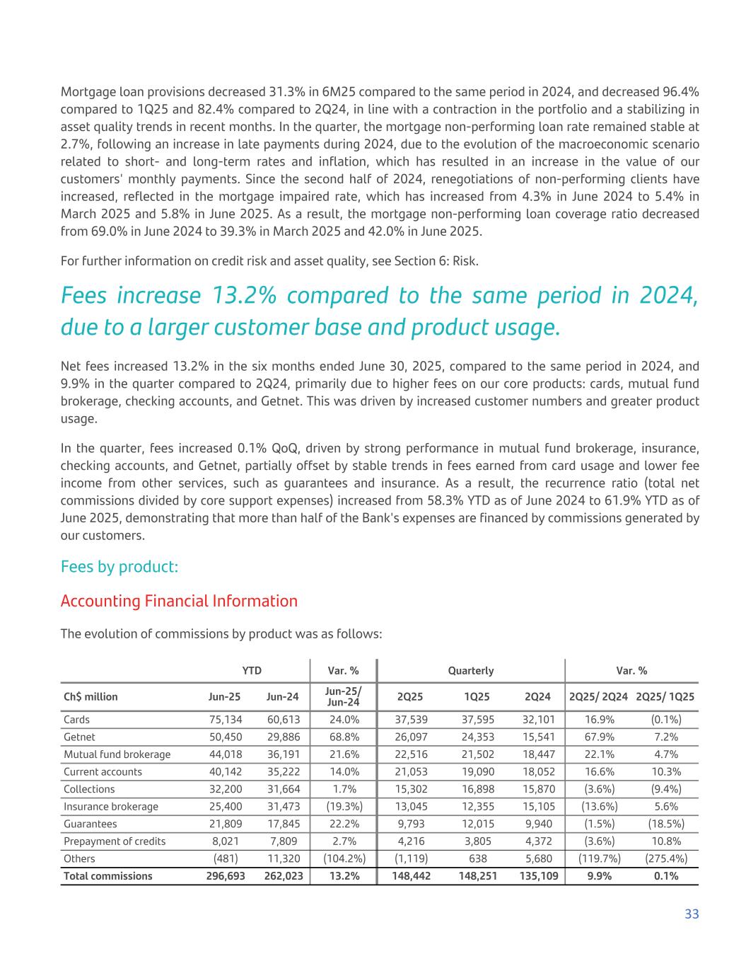 Mortgage loan provisions decreased 31.3% in 6M25 compared to the same period in 2024, and decreased 96.4% compared to 1Q25 and 82.4% compared to 2Q24, in line with a contraction in the portfolio and a stabilizing in asset quality trends in recent months. In the quarter, the mortgage non-performing loan rate remained stable at 2.7%, following an increase in late payments during 2024, due to the evolution of the macroeconomic scenario related to short- and long-term rates and inflation, which has resulted in an increase in the value of our customers' monthly payments. Since the second half of 2024, renegotiations of non-performing clients have increased, reflected in the mortgage impaired rate, which has increased from 4.3% in June 2024 to 5.4% in March 2025 and 5.8% in June 2025. As a result, the mortgage non-performing loan coverage ratio decreased from 69.0% in June 2024 to 39.3% in March 2025 and 42.0% in June 2025. For further information on credit risk and asset quality, see Section 6: Risk. Fees increase 13.2% compared to the same period in 2024, due to a larger customer base and product usage. Net fees increased 13.2% in the six months ended June 30, 2025, compared to the same period in 2024, and 9.9% in the quarter compared to 2Q24, primarily due to higher fees on our core products: cards, mutual fund brokerage, checking accounts, and Getnet. This was driven by increased customer numbers and greater product usage. In the quarter, fees increased 0.1% QoQ, driven by strong performance in mutual fund brokerage, insurance, checking accounts, and Getnet, partially offset by stable trends in fees earned from card usage and lower fee income from other services, such as guarantees and insurance. As a result, the recurrence ratio (total net commissions divided by core support expenses) increased from 58.3% YTD as of June 2024 to 61.9% YTD as of June 2025, demonstrating that more than half of the Bank's expenses are financed by commissions generated by our customers. Fees by product: Accounting Financial Information The evolution of commissions by product was as follows: YTD Var. % Quarterly Var. % Ch$ million Jun-25 Jun-24 Jun-25/ Jun-24 2Q25 1Q25 2Q24 2Q25/ 2Q24 2Q25/ 1Q25 Cards 75,134 60,613 24.0% 37,539 37,595 32,101 16.9% (0.1%) Getnet 50,450 29,886 68.8% 26,097 24,353 15,541 67.9% 7.2% Mutual fund brokerage 44,018 36,191 21.6% 22,516 21,502 18,447 22.1% 4.7% Current accounts 40,142 35,222 14.0% 21,053 19,090 18,052 16.6% 10.3% Collections 32,200 31,664 1.7% 15,302 16,898 15,870 (3.6%) (9.4%) Insurance brokerage 25,400 31,473 (19.3%) 13,045 12,355 15,105 (13.6%) 5.6% Guarantees 21,809 17,845 22.2% 9,793 12,015 9,940 (1.5%) (18.5%) Prepayment of credits 8,021 7,809 2.7% 4,216 3,805 4,372 (3.6%) 10.8% Others (481) 11,320 (104.2%) (1,119) 638 5,680 (119.7%) (275.4%) Total commissions 296,693 262,023 13.2% 148,442 148,251 135,109 9.9% 0.1% 33