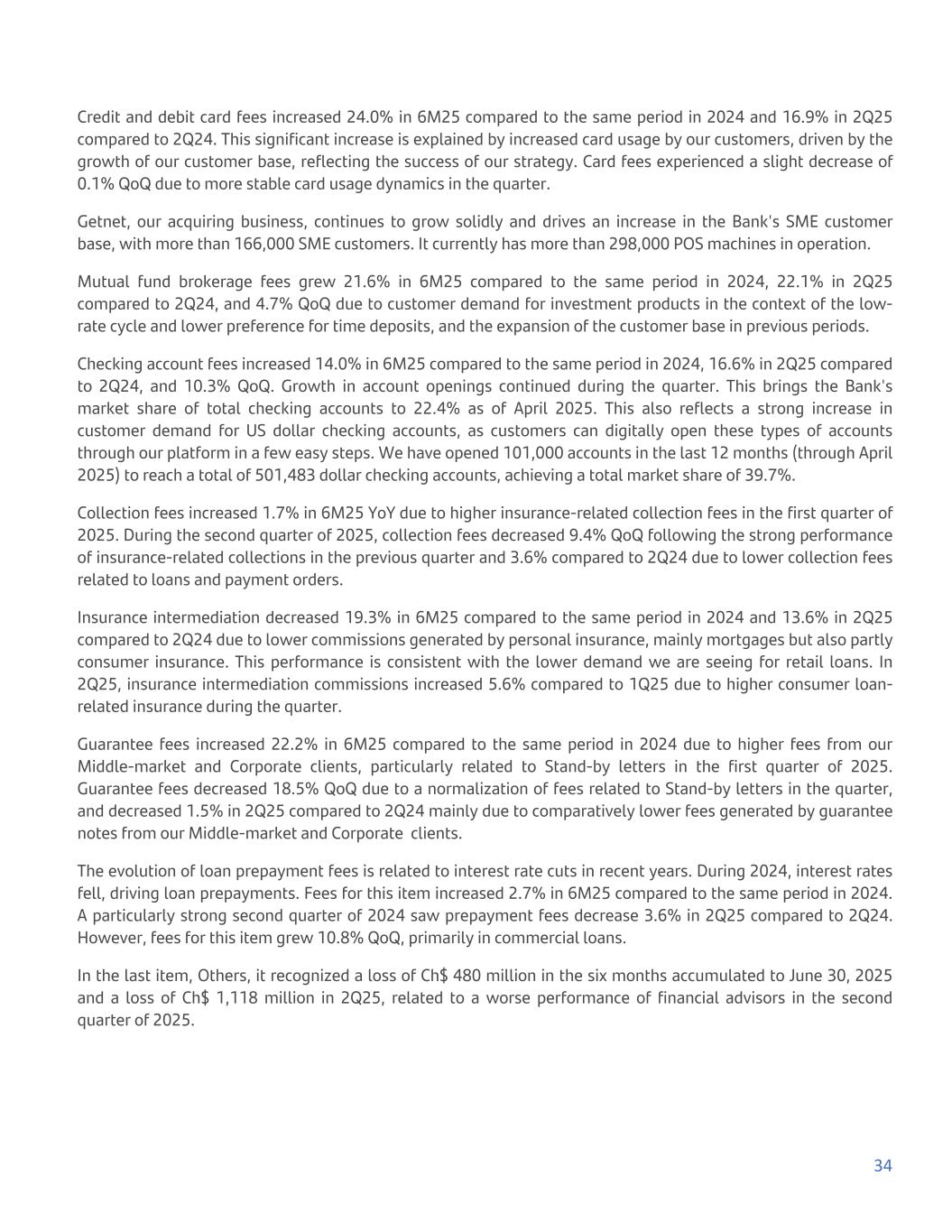 Credit and debit card fees increased 24.0% in 6M25 compared to the same period in 2024 and 16.9% in 2Q25 compared to 2Q24. This significant increase is explained by increased card usage by our customers, driven by the growth of our customer base, reflecting the success of our strategy. Card fees experienced a slight decrease of 0.1% QoQ due to more stable card usage dynamics in the quarter. Getnet, our acquiring business, continues to grow solidly and drives an increase in the Bank's SME customer base, with more than 166,000 SME customers. It currently has more than 298,000 POS machines in operation. Mutual fund brokerage fees grew 21.6% in 6M25 compared to the same period in 2024, 22.1% in 2Q25 compared to 2Q24, and 4.7% QoQ due to customer demand for investment products in the context of the low- rate cycle and lower preference for time deposits, and the expansion of the customer base in previous periods. Checking account fees increased 14.0% in 6M25 compared to the same period in 2024, 16.6% in 2Q25 compared to 2Q24, and 10.3% QoQ. Growth in account openings continued during the quarter. This brings the Bank's market share of total checking accounts to 22.4% as of April 2025. This also reflects a strong increase in customer demand for US dollar checking accounts, as customers can digitally open these types of accounts through our platform in a few easy steps. We have opened 101,000 accounts in the last 12 months (through April 2025) to reach a total of 501,483 dollar checking accounts, achieving a total market share of 39.7%. Collection fees increased 1.7% in 6M25 YoY due to higher insurance-related collection fees in the first quarter of 2025. During the second quarter of 2025, collection fees decreased 9.4% QoQ following the strong performance of insurance-related collections in the previous quarter and 3.6% compared to 2Q24 due to lower collection fees related to loans and payment orders. Insurance intermediation decreased 19.3% in 6M25 compared to the same period in 2024 and 13.6% in 2Q25 compared to 2Q24 due to lower commissions generated by personal insurance, mainly mortgages but also partly consumer insurance. This performance is consistent with the lower demand we are seeing for retail loans. In 2Q25, insurance intermediation commissions increased 5.6% compared to 1Q25 due to higher consumer loan- related insurance during the quarter. Guarantee fees increased 22.2% in 6M25 compared to the same period in 2024 due to higher fees from our Middle-market and Corporate clients, particularly related to Stand-by letters in the first quarter of 2025. Guarantee fees decreased 18.5% QoQ due to a normalization of fees related to Stand-by letters in the quarter, and decreased 1.5% in 2Q25 compared to 2Q24 mainly due to comparatively lower fees generated by guarantee notes from our Middle-market and Corporate clients. The evolution of loan prepayment fees is related to interest rate cuts in recent years. During 2024, interest rates fell, driving loan prepayments. Fees for this item increased 2.7% in 6M25 compared to the same period in 2024. A particularly strong second quarter of 2024 saw prepayment fees decrease 3.6% in 2Q25 compared to 2Q24. However, fees for this item grew 10.8% QoQ, primarily in commercial loans. In the last item, Others, it recognized a loss of Ch$ 480 million in the six months accumulated to June 30, 2025 and a loss of Ch$ 1,118 million in 2Q25, related to a worse performance of financial advisors in the second quarter of 2025. 34