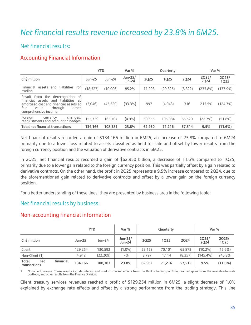 Net financial results revenue increased by 23.8% in 6M25. Net financial results: Accounting Financial Information YTD Var % Quarterly Var % Ch$ million Jun-25 Jun-24 Jun-25/ Jun-24 2Q25 1Q25 2Q24 2Q25/ 2Q24 2Q25/ 1Q25 Financial assets and liabilities for trading (18,527) (10,006) 85.2% 11,298 (29,825) (8,322) (235.8%) (137.9%) Result from the derecognition of financial assets and liabilities at amortized cost and financial assets at fair value through other comprehensive income (3,046) (45,320) (93.3%) 997 (4,043) 316 215.5% (124.7%) Foreign currency changes, readjustments and accounting hedges 155,739 163,707 (4.9%) 50,655 105,084 65,520 (22.7%) (51.8%) Total net financial transactions 134,166 108,381 23.8% 62,950 71,216 57,514 9.5% (11.6%) Net financial results recorded a gain of $134,166 million in 6M25, an increase of 23.8% compared to 6M24 primarily due to a lower loss related to assets classified as held for sale and offset by lower results from the foreign currency position and the valuation of derivative contracts in 6M25. In 2Q25, net financial results recorded a gain of $62,950 billion, a decrease of 11.6% compared to 1Q25, primarily due to a lower gain related to the foreign currency position. This was partially offset by a gain related to derivative contracts. On the other hand, the profit in 2Q25 represents a 9.5% increase compared to 2Q24, due to the aforementioned gain related to derivative contracts and offset by a lower gain on the foreign currency position. For a better understanding of these lines, they are presented by business area in the following table: Net financial results by business: Non-accounting financial information YTD Var % Quarterly Var % Ch$ million Jun-25 Jun-24 Jun-25/ Jun-24 2Q25 1Q25 2Q24 2Q25/ 2Q24 2Q25/ 1Q25 Client 129,254 130,592 (1.0%) 59,153 70,101 65,873 (10.2%) (15.6%) Non-Client (1) 4,912 (22,209) –% 3,797 1,114 (8,357) (145.4%) 240.8% Total net financial transactions 134,166 108,383 23.8% 62,951 71,216 57,515 9.5% (11.6%) 1. Non-client income. These results include interest and mark-to-market effects from the Bank's trading portfolio, realized gains from the available-for-sale portfolio, and other results from the Finance Division. Client treasury services revenues reached a profit of $129,254 million in 6M25, a slight decrease of 1.0% explained by exchange rate effects and offset by a strong performance from the trading strategy. This line 35