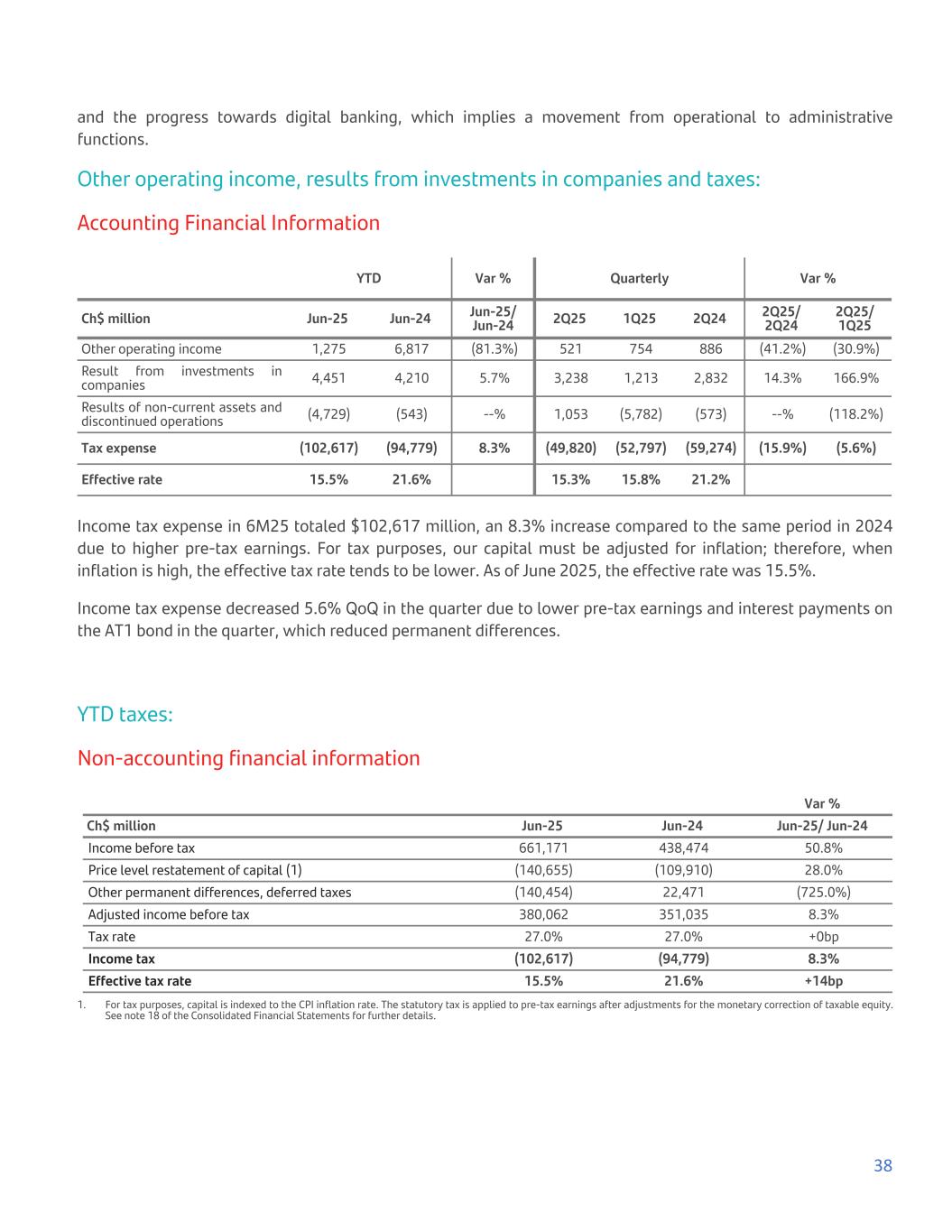 and the progress towards digital banking, which implies a movement from operational to administrative functions. Other operating income, results from investments in companies and taxes: Accounting Financial Information YTD Var % Quarterly Var % Ch$ million Jun-25 Jun-24 Jun-25/ Jun-24 2Q25 1Q25 2Q24 2Q25/ 2Q24 2Q25/ 1Q25 Other operating income 1,275 6,817 (81.3%) 521 754 886 (41.2%) (30.9%) Result from investments in companies 4,451 4,210 5.7% 3,238 1,213 2,832 14.3% 166.9% Results of non-current assets and discontinued operations (4,729) (543) --% 1,053 (5,782) (573) --% (118.2%) Tax expense (102,617) (94,779) 8.3% (49,820) (52,797) (59,274) (15.9%) (5.6%) Effective rate 15.5% 21.6%   15.3% 15.8% 21.2% Income tax expense in 6M25 totaled $102,617 million, an 8.3% increase compared to the same period in 2024 due to higher pre-tax earnings. For tax purposes, our capital must be adjusted for inflation; therefore, when inflation is high, the effective tax rate tends to be lower. As of June 2025, the effective rate was 15.5%. Income tax expense decreased 5.6% QoQ in the quarter due to lower pre-tax earnings and interest payments on the AT1 bond in the quarter, which reduced permanent differences. YTD taxes: Non-accounting financial information Var % Ch$ million Jun-25 Jun-24 Jun-25/ Jun-24 Income before tax 661,171 438,474 50.8% Price level restatement of capital (1) (140,655) (109,910) 28.0% Other permanent differences, deferred taxes (140,454) 22,471 (725.0%) Adjusted income before tax 380,062 351,035 8.3% Tax rate 27.0% 27.0% +0bp Income tax (102,617) (94,779) 8.3% Effective tax rate 15.5% 21.6% +14bp 1. For tax purposes, capital is indexed to the CPI inflation rate. The statutory tax is applied to pre-tax earnings after adjustments for the monetary correction of taxable equity. See note 18 of the Consolidated Financial Statements for further details. 38