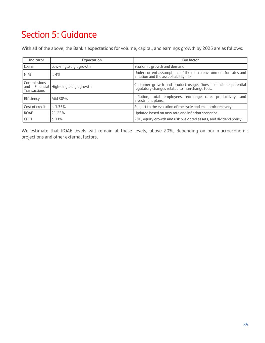 Section 5: Guidance With all of the above, the Bank's expectations for volume, capital, and earnings growth by 2025 are as follows: Indicator Expectation Key factor Loans Low-single digit growth Economic growth and demand NIM c. 4% Under current assumptions of the macro environment for rates and inflation and the asset-liability mix. Commissions and Financial Transactions High-single digit growth Customer growth and product usage. Does not include potential regulatory changes related to interchange fees. Efficiency Mid 30%s Inflation, total employees, exchange rate, productivity, and investment plans. Cost of credit c. 1.35% Subject to the evolution of the cycle and economic recovery. ROAE 21-23% Updated based on new rate and inflation scenarios. CET1 c. 11% ROE, equity growth and risk-weighted assets, and dividend policy. We estimate that ROAE levels will remain at these levels, above 20%, depending on our macroeconomic projections and other external factors. 39