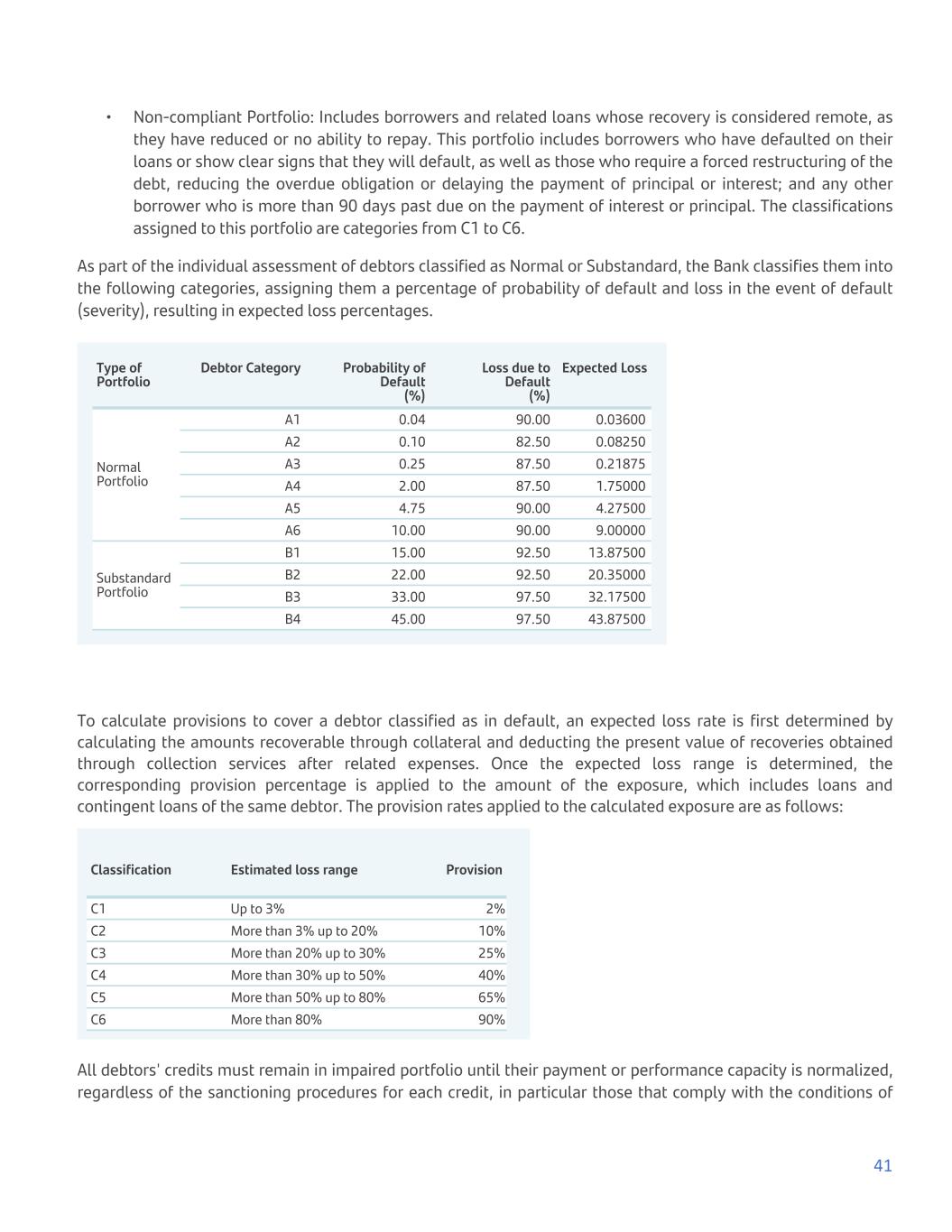 • Non-compliant Portfolio: Includes borrowers and related loans whose recovery is considered remote, as they have reduced or no ability to repay. This portfolio includes borrowers who have defaulted on their loans or show clear signs that they will default, as well as those who require a forced restructuring of the debt, reducing the overdue obligation or delaying the payment of principal or interest; and any other borrower who is more than 90 days past due on the payment of interest or principal. The classifications assigned to this portfolio are categories from C1 to C6. As part of the individual assessment of debtors classified as Normal or Substandard, the Bank classifies them into the following categories, assigning them a percentage of probability of default and loss in the event of default (severity), resulting in expected loss percentages. Type of Portfolio Debtor Category Probability of Default (%) Loss due to Default (%) Expected Loss Normal Portfolio A1 0.04 90.00 0.03600 A2 0.10 82.50 0.08250 A3 0.25 87.50 0.21875 A4 2.00 87.50 1.75000 A5 4.75 90.00 4.27500 A6 10.00 90.00 9.00000 Substandard Portfolio B1 15.00 92.50 13.87500 B2 22.00 92.50 20.35000 B3 33.00 97.50 32.17500 B4 45.00 97.50 43.87500 To calculate provisions to cover a debtor classified as in default, an expected loss rate is first determined by calculating the amounts recoverable through collateral and deducting the present value of recoveries obtained through collection services after related expenses. Once the expected loss range is determined, the corresponding provision percentage is applied to the amount of the exposure, which includes loans and contingent loans of the same debtor. The provision rates applied to the calculated exposure are as follows: Classification Estimated loss range Provision C1 Up to 3% 2% C2 More than 3% up to 20% 10% C3 More than 20% up to 30% 25% C4 More than 30% up to 50% 40% C5 More than 50% up to 80% 65% C6 More than 80% 90% All debtors' credits must remain in impaired portfolio until their payment or performance capacity is normalized, regardless of the sanctioning procedures for each credit, in particular those that comply with the conditions of 41