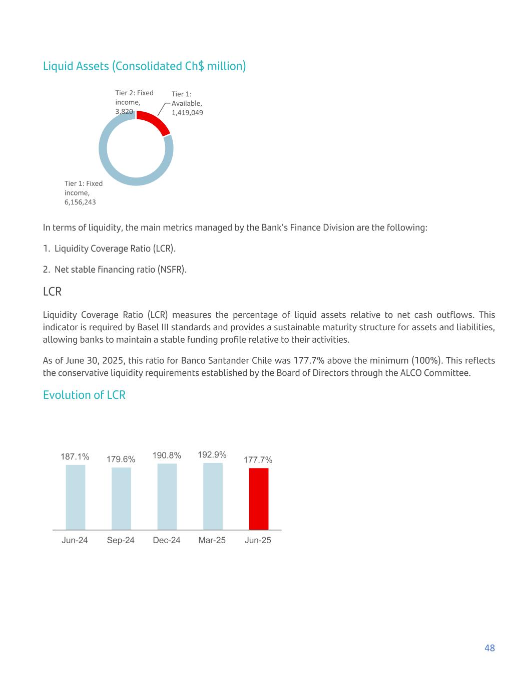 Liquid Assets (Consolidated Ch$ million) Tier 1: Available, 1,419,049 Tier 1: Fixed income, 6,156,243 Tier 2: Fixed income, 3,820 In terms of liquidity, the main metrics managed by the Bank's Finance Division are the following: 1. Liquidity Coverage Ratio (LCR). 2. Net stable financing ratio (NSFR). LCR Liquidity Coverage Ratio (LCR) measures the percentage of liquid assets relative to net cash outflows. This indicator is required by Basel III standards and provides a sustainable maturity structure for assets and liabilities, allowing banks to maintain a stable funding profile relative to their activities. As of June 30, 2025, this ratio for Banco Santander Chile was 177.7% above the minimum (100%). This reflects the conservative liquidity requirements established by the Board of Directors through the ALCO Committee. Evolution of LCR 187.1% 179.6% 190.8% 192.9% 177.7% Jun-24 Sep-24 Dec-24 Mar-25 Jun-25 48