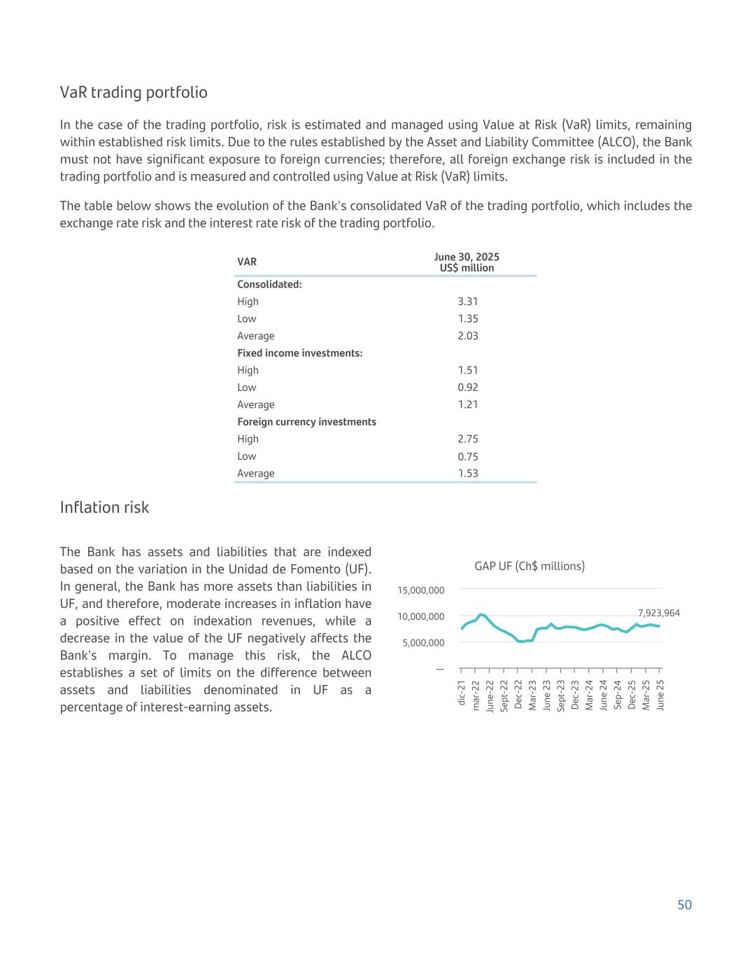 VaR trading portfolio In the case of the trading portfolio, risk is estimated and managed using Value at Risk (VaR) limits, remaining within established risk limits. Due to the rules established by the Asset and Liability Committee (ALCO), the Bank must not have significant exposure to foreign currencies; therefore, all foreign exchange risk is included in the trading portfolio and is measured and controlled using Value at Risk (VaR) limits. The table below shows the evolution of the Bank's consolidated VaR of the trading portfolio, which includes the exchange rate risk and the interest rate risk of the trading portfolio. VAR June 30, 2025 US$ million Consolidated: High 3.31 Low 1.35 Average 2.03 Fixed income investments: High 1.51 Low 0.92 Average 1.21 Foreign currency investments High 2.75 Low 0.75 Average 1.53 Inflation risk The Bank has assets and liabilities that are indexed based on the variation in the Unidad de Fomento (UF). In general, the Bank has more assets than liabilities in UF, and therefore, moderate increases in inflation have a positive effect on indexation revenues, while a decrease in the value of the UF negatively affects the Bank's margin. To manage this risk, the ALCO establishes a set of limits on the difference between assets and liabilities denominated in UF as a percentage of interest-earning assets. GAP UF (Ch$ millions) 7,923,964 di c- 21 m ar -2 2 Ju ne -2 2 Se pt -2 2 De c- 22 M ar -2 3 Ju ne 2 3 Se pt -2 3 De c- 23 M ar -2 4 Ju ne 2 4 Se p- 24 De c- 25 M ar -2 5 Ju ne 2 5 — 5,000,000 10,000,000 15,000,000 50