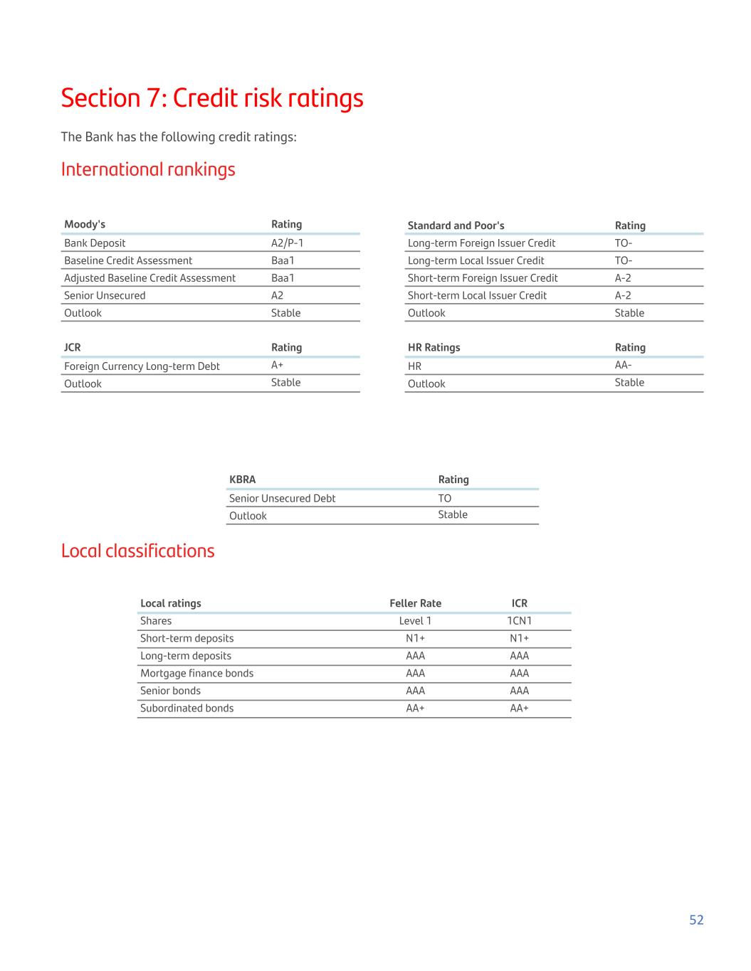 Section 7: Credit risk ratings The Bank has the following credit ratings: International rankings Moody's Rating Bank Deposit A2/P-1 Baseline Credit Assessment Baa1 Adjusted Baseline Credit Assessment Baa1 Senior Unsecured A2 Outlook Stable Standard and Poor's Rating Long-term Foreign Issuer Credit TO- Long-term Local Issuer Credit TO- Short-term Foreign Issuer Credit A-2 Short-term Local Issuer Credit A-2 Outlook Stable JCR Rating Foreign Currency Long-term Debt A+ Outlook Stable HR Ratings Rating HR AA- Outlook Stable KBRA Rating Senior Unsecured Debt TO Outlook Stable Local classifications Local ratings Feller Rate ICR Shares Level 1 1CN1 Short-term deposits N1+ N1+ Long-term deposits AAA AAA Mortgage finance bonds AAA AAA Senior bonds AAA AAA Subordinated bonds AA+ AA+ 52