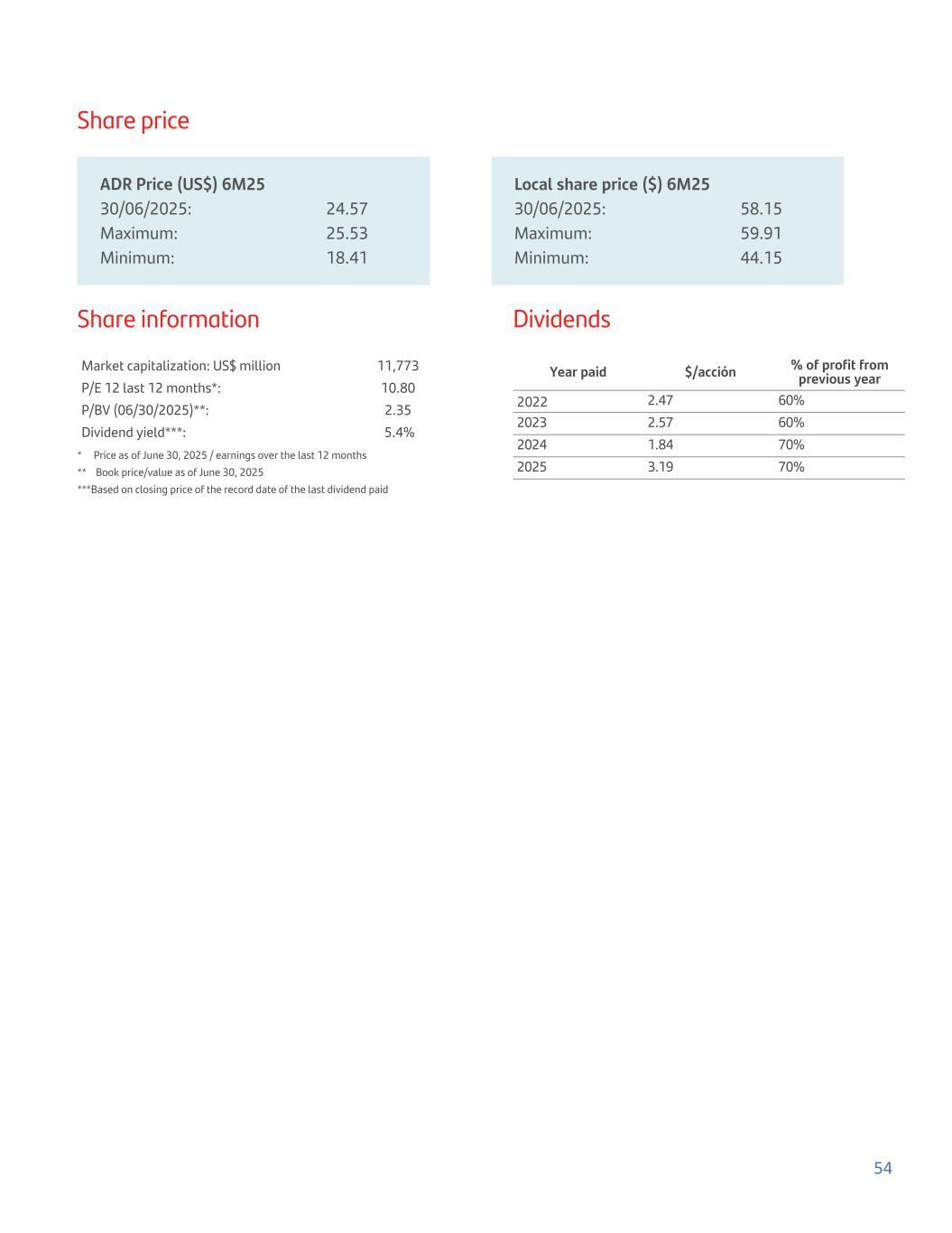 Share price ADR Price (US$) 6M25 Local share price ($) 6M25 30/06/2025: 24.57 30/06/2025: 58.15 Maximum: 25.53 Maximum: 59.91 Minimum: 18.41 Minimum: 44.15 Share information Market capitalization: US$ million 11,773 P/E 12 last 12 months*: 10.80 P/BV (06/30/2025)**: 2.35 Dividend yield***: 5.4% *     Price as of June 30, 2025 / earnings over the last 12 months **    Book price/value as of June 30, 2025 ***Based on closing price of the record date of the last dividend paid Dividends Year paid $/acción % of profit from previous year 2022 2.47 60% 2023 2.57 60% 2024 1.84 70% 2025 3.19 70% 54