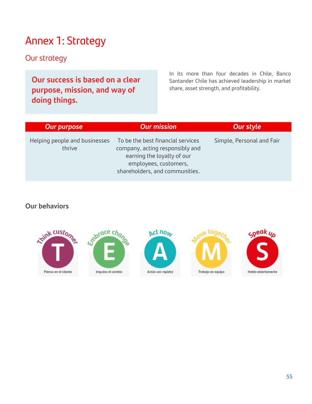 Annex 1: Strategy Our strategy In its more than four decades in Chile, Banco Santander Chile has achieved leadership in market share, asset strength, and profitability. Our success is based on a clear purpose, mission, and way of doing things. Our purpose Our mission Our style Helping people and businesses thrive To be the best financial services company, acting responsibly and earning the loyalty of our employees, customers, shareholders, and communities. Simple, Personal and Fair Our behaviors 55