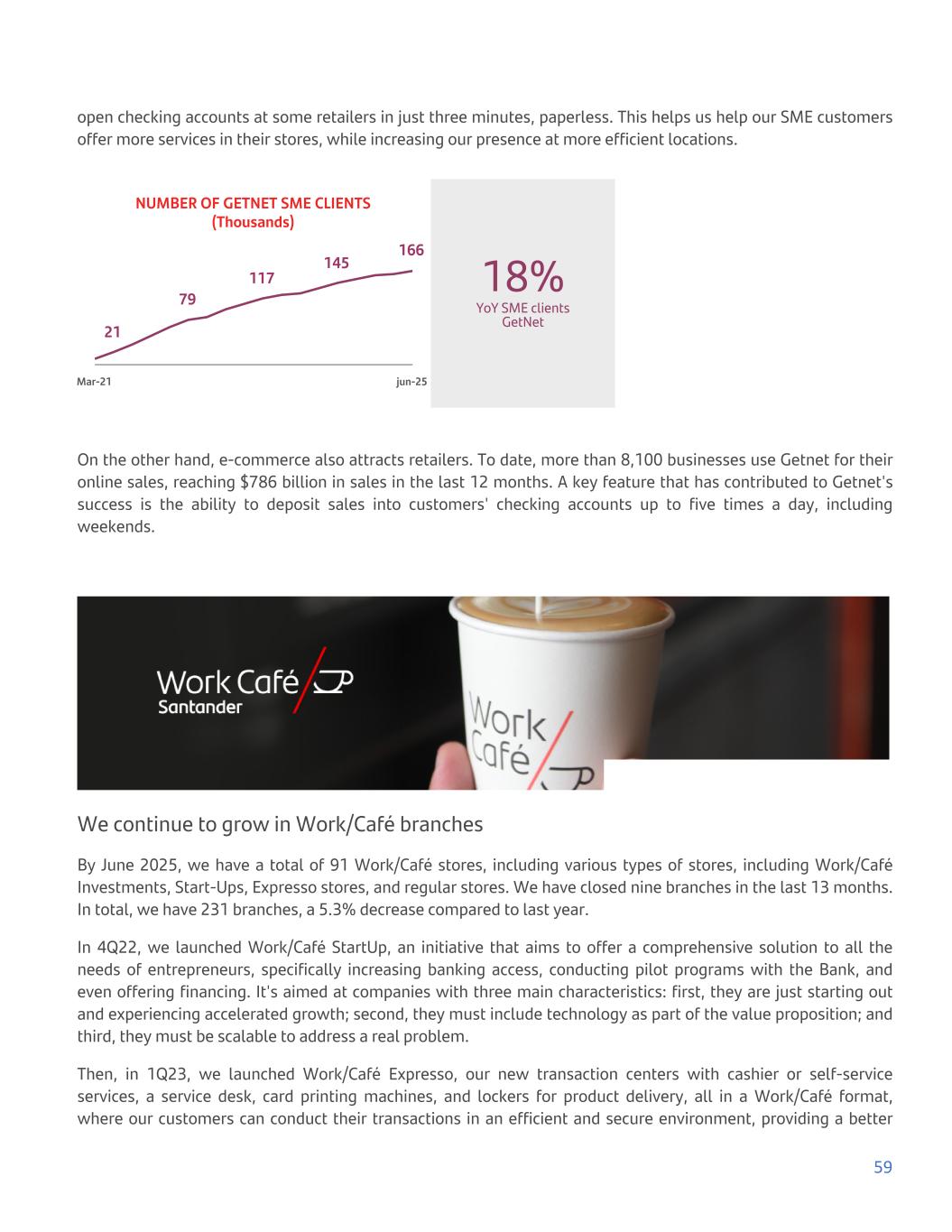 open checking accounts at some retailers in just three minutes, paperless. This helps us help our SME customers offer more services in their stores, while increasing our presence at more efficient locations. NUMBER OF GETNET SME CLIENTS (Thousands) 21 79 117 145 166 Mar-21 jun-25 18% YoY SME clients GetNet On the other hand, e-commerce also attracts retailers. To date, more than 8,100 businesses use Getnet for their online sales, reaching $786 billion in sales in the last 12 months. A key feature that has contributed to Getnet's success is the ability to deposit sales into customers' checking accounts up to five times a day, including weekends. We continue to grow in Work/Café branches By June 2025, we have a total of 91 Work/Café stores, including various types of stores, including Work/Café Investments, Start-Ups, Expresso stores, and regular stores. We have closed nine branches in the last 13 months. In total, we have 231 branches, a 5.3% decrease compared to last year. In 4Q22, we launched Work/Café StartUp, an initiative that aims to offer a comprehensive solution to all the needs of entrepreneurs, specifically increasing banking access, conducting pilot programs with the Bank, and even offering financing. It's aimed at companies with three main characteristics: first, they are just starting out and experiencing accelerated growth; second, they must include technology as part of the value proposition; and third, they must be scalable to address a real problem. Then, in 1Q23, we launched Work/Café Expresso, our new transaction centers with cashier or self-service services, a service desk, card printing machines, and lockers for product delivery, all in a Work/Café format, where our customers can conduct their transactions in an efficient and secure environment, providing a better 59
