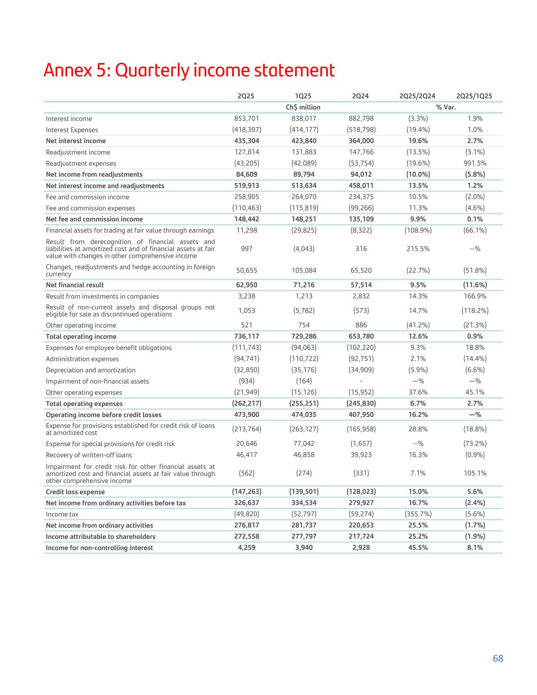 Annex 5: Quarterly income statement 2Q25 1Q25 2Q24 2Q25/2Q24 2Q25/1Q25   Ch$ million % Var. Interest income 853,701 838,017 882,798 (3.3%) 1.9% Interest Expenses (418,397) (414,177) (518,798) (19.4%) 1.0% Net interest income 435,304 423,840 364,000 19.6% 2.7% Readjustment income 127,814 131,883 147,766 (13.5%) (3.1%) Readjustment expenses (43,205) (42,089) (53,754) (19.6%) 991.5% Net income from readjustments 84,609 89,794 94,012 (10.0%) (5.8%) Net interest income and readjustments 519,913 513,634 458,011 13.5% 1.2% Fee and commission income 258,905 264,070 234,375 10.5% (2.0%) Fee and commission expenses (110,463) (115,819) (99,266) 11.3% (4.6%) Net fee and commission income 148,442 148,251 135,109 9.9% 0.1% Financial assets for trading at fair value through earnings 11,298 (29,825) (8,322) (108.9%) (66.1%) Result from derecognition of financial assets and liabilities at amortized cost and of financial assets at fair value with changes in other comprehensive income 997 (4,043) 316 215.5% --% Changes, readjustments and hedge accounting in foreign currency 50,655 105,084 65,520 (22.7%) (51.8%) Net financial result 62,950 71,216 57,514 9.5% (11.6%) Result from investments in companies 3,238 1,213 2,832 14.3% 166.9% Result of non-current assets and disposal groups not eligible for sale as discontinued operations 1,053 (5,782) (573) 14.7% (118.2%) Other operating income 521 754 886 (41.2%) (21.3%) Total operating income 736,117 729,286 653,780 12.6% 0.9% Expenses for employee benefit obligations (111,743) (94,063) (102,220) 9.3% 18.8% Administration expenses (94,741) (110,722) (92,751) 2.1% (14.4%) Depreciation and amortization (32,850) (35,176) (34,909) (5.9%) (6.6%) Impairment of non-financial assets (934) (164) - —% —% Other operating expenses (21,949) (15,126) (15,952) 37.6% 45.1% Total operating expenses (262,217) (255,251) (245,830) 6.7% 2.7% Operating income before credit losses 473,900 474,035 407,950 16.2% —% Expense for provisions established for credit risk of loans at amortized cost (213,764) (263,127) (165,958) 28.8% (18.8%) Expense for special provisions for credit risk 20,646 77,042 (1,657) --% (73.2%) Recovery of written-off loans 46,417 46,858 39,923 16.3% (0.9%) Impairment for credit risk for other financial assets at amortized cost and financial assets at fair value through other comprehensive income (562) (274) (331) 7.1% 105.1% Credit loss expense (147,263) (139,501) (128,023) 15.0% 5.6% Net income from ordinary activities before tax 326,637 334,534 279,927 16.7% (2.4%) Income tax (49,820) (52,797) (59,274) (355.7%) (5.6%) Net income from ordinary activities 276,817 281,737 220,653 25.5% (1.7%) Income attributable to shareholders 272,558 277,797 217,724 25.2% (1.9%) Income for non-controlling interest 4,259 3,940 2,928 45.5% 8.1% 68