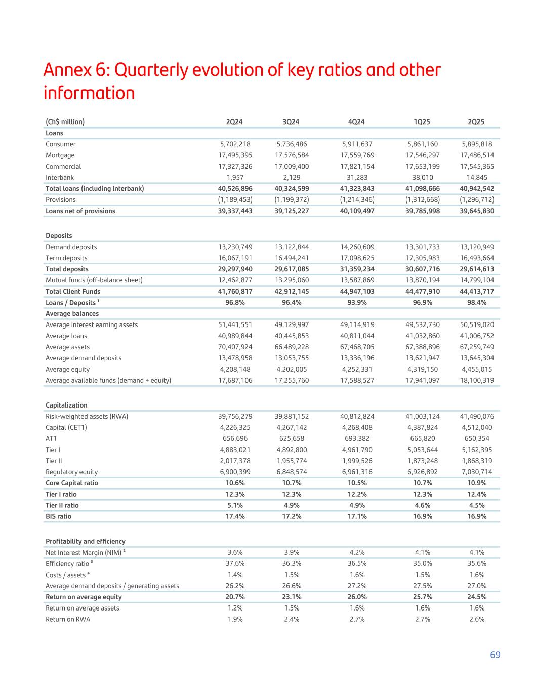 Annex 6: Quarterly evolution of key ratios and other information (Ch$ million) 2Q24 3Q24 4Q24 1Q25 2Q25 Loans Consumer 5,702,218 5,736,486 5,911,637 5,861,160 5,895,818 Mortgage 17,495,395 17,576,584 17,559,769 17,546,297 17,486,514 Commercial 17,327,326 17,009,400 17,821,154 17,653,199 17,545,365 Interbank 1,957 2,129 31,283 38,010 14,845 Total loans (including interbank) 40,526,896 40,324,599 41,323,843 41,098,666 40,942,542 Provisions (1,189,453) (1,199,372) (1,214,346) (1,312,668) (1,296,712) Loans net of provisions 39,337,443 39,125,227 40,109,497 39,785,998 39,645,830 Deposits Demand deposits 13,230,749 13,122,844 14,260,609 13,301,733 13,120,949 Term deposits 16,067,191 16,494,241 17,098,625 17,305,983 16,493,664 Total deposits 29,297,940 29,617,085 31,359,234 30,607,716 29,614,613 Mutual funds (off-balance sheet) 12,462,877 13,295,060 13,587,869 13,870,194 14,799,104 Total Client Funds 41,760,817 42,912,145 44,947,103 44,477,910 44,413,717 Loans / Deposits ¹ 96.8% 96.4% 93.9% 96.9% 98.4% Average balances Average interest earning assets 51,441,551 49,129,997 49,114,919 49,532,730 50,519,020 Average loans 40,989,844 40,445,853 40,811,044 41,032,860 41,006,752 Average assets 70,407,924 66,489,228 67,468,705 67,388,896 67,259,749 Average demand deposits 13,478,958 13,053,755 13,336,196 13,621,947 13,645,304 Average equity 4,208,148 4,202,005 4,252,331 4,319,150 4,455,015 Average available funds (demand + equity) 17,687,106 17,255,760 17,588,527 17,941,097 18,100,319 Capitalization Risk-weighted assets (RWA) 39,756,279 39,881,152 40,812,824 41,003,124 41,490,076 Capital (CET1) 4,226,325 4,267,142 4,268,408 4,387,824 4,512,040 AT1 656,696 625,658 693,382 665,820 650,354 Tier I 4,883,021 4,892,800 4,961,790 5,053,644 5,162,395 Tier II 2,017,378 1,955,774 1,999,526 1,873,248 1,868,319 Regulatory equity 6,900,399 6,848,574 6,961,316 6,926,892 7,030,714 Core Capital ratio 10.6% 10.7% 10.5% 10.7% 10.9% Tier I ratio 12.3% 12.3% 12.2% 12.3% 12.4% Tier II ratio 5.1% 4.9% 4.9% 4.6% 4.5% BIS ratio 17.4% 17.2% 17.1% 16.9% 16.9% Profitability and efficiency Net Interest Margin (NIM) ² 3.6% 3.9% 4.2% 4.1% 4.1% Efficiency ratio ³ 37.6% 36.3% 36.5% 35.0% 35.6% Costs / assets ⁴ 1.4% 1.5% 1.6% 1.5% 1.6% Average demand deposits / generating assets 26.2% 26.6% 27.2% 27.5% 27.0% Return on average equity 20.7% 23.1% 26.0% 25.7% 24.5% Return on average assets 1.2% 1.5% 1.6% 1.6% 1.6% Return on RWA 1.9% 2.4% 2.7% 2.7% 2.6% 69