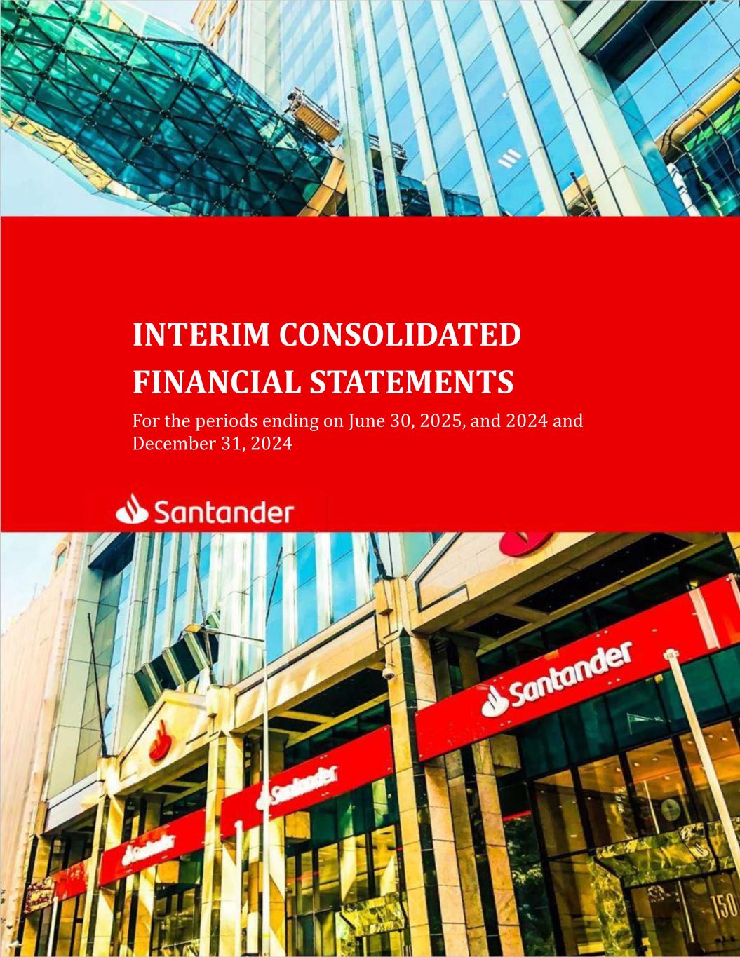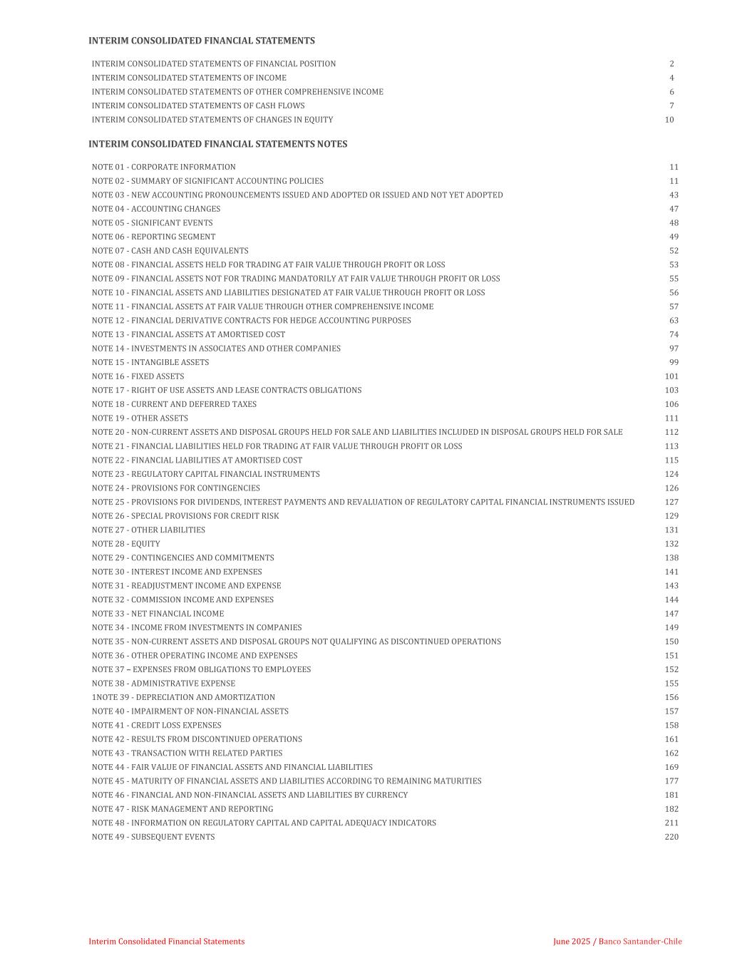 Interim Consolidated Financial Statements June 2025 / Banco Santander-Chile INTERIM CONSOLIDATED FINANCIAL STATEMENTS INTERIM CONSOLIDATED STATEMENTS OF FINANCIAL POSITION 2 INTERIM CONSOLIDATED STATEMENTS OF INCOME 4 INTERIM CONSOLIDATED STATEMENTS OF OTHER COMPREHENSIVE INCOME 6 INTERIM CONSOLIDATED STATEMENTS OF CASH FLOWS 7 INTERIM CONSOLIDATED STATEMENTS OF CHANGES IN EQUITY 10 INTERIM CONSOLIDATED FINANCIAL STATEMENTS NOTES NOTE 01 - CORPORATE INFORMATION 11 NOTE 02 - SUMMARY OF SIGNIFICANT ACCOUNTING POLICIES 11 NOTE 03 - NEW ACCOUNTING PRONOUNCEMENTS ISSUED AND ADOPTED OR ISSUED AND NOT YET ADOPTED 43 NOTE 04 - ACCOUNTING CHANGES 47 NOTE 05 - SIGNIFICANT EVENTS 48 NOTE 06 - REPORTING SEGMENT 49 NOTE 07 - CASH AND CASH EQUIVALENTS 52 NOTE 08 - FINANCIAL ASSETS HELD FOR TRADING AT FAIR VALUE THROUGH PROFIT OR LOSS 53 NOTE 09 - FINANCIAL ASSETS NOT FOR TRADING MANDATORILY AT FAIR VALUE THROUGH PROFIT OR LOSS 55 NOTE 10 - FINANCIAL ASSETS AND LIABILITIES DESIGNATED AT FAIR VALUE THROUGH PROFIT OR LOSS 56 NOTE 11 - FINANCIAL ASSETS AT FAIR VALUE THROUGH OTHER COMPREHENSIVE INCOME 57 NOTE 12 - FINANCIAL DERIVATIVE CONTRACTS FOR HEDGE ACCOUNTING PURPOSES 63 NOTE 13 - FINANCIAL ASSETS AT AMORTISED COST 74 NOTE 14 - INVESTMENTS IN ASSOCIATES AND OTHER COMPANIES 97 NOTE 15 - INTANGIBLE ASSETS 99 NOTE 16 - FIXED ASSETS 101 NOTE 17 - RIGHT OF USE ASSETS AND LEASE CONTRACTS OBLIGATIONS 103 NOTE 18 - CURRENT AND DEFERRED TAXES 106 NOTE 19 - OTHER ASSETS 111 NOTE 20 - NON-CURRENT ASSETS AND DISPOSAL GROUPS HELD FOR SALE AND LIABILITIES INCLUDED IN DISPOSAL GROUPS HELD FOR SALE 112 NOTE 21 - FINANCIAL LIABILITIES HELD FOR TRADING AT FAIR VALUE THROUGH PROFIT OR LOSS 113 NOTE 22 - FINANCIAL LIABILITIES AT AMORTISED COST 115 NOTE 23 - REGULATORY CAPITAL FINANCIAL INSTRUMENTS 124 NOTE 24 - PROVISIONS FOR CONTINGENCIES 126 NOTE 25 - PROVISIONS FOR DIVIDENDS, INTEREST PAYMENTS AND REVALUATION OF REGULATORY CAPITAL FINANCIAL INSTRUMENTS ISSUED 127 NOTE 26 - SPECIAL PROVISIONS FOR CREDIT RISK 129 NOTE 27 - OTHER LIABILITIES 131 NOTE 28 - EQUITY 132 NOTE 29 - CONTINGENCIES AND COMMITMENTS 138 NOTE 30 - INTEREST INCOME AND EXPENSES 141 NOTE 31 - READJUSTMENT INCOME AND EXPENSE 143 NOTE 32 - COMMISSION INCOME AND EXPENSES 144 NOTE 33 - NET FINANCIAL INCOME 147 NOTE 34 - INCOME FROM INVESTMENTS IN COMPANIES 149 NOTE 35 - NON-CURRENT ASSETS AND DISPOSAL GROUPS NOT QUALIFYING AS DISCONTINUED OPERATIONS 150 NOTE 36 - OTHER OPERATING INCOME AND EXPENSES 151 NOTE 37 EXPENSES FROM OBLIGATIONS TO EMPLOYEES 152 NOTE 38 - ADMINISTRATIVE EXPENSE 155 1NOTE 39 - DEPRECIATION AND AMORTIZATION 156 NOTE 40 - IMPAIRMENT OF NON-FINANCIAL ASSETS 157 NOTE 41 - CREDIT LOSS EXPENSES 158 NOTE 42 - RESULTS FROM DISCONTINUED OPERATIONS 161 NOTE 43 - TRANSACTION WITH RELATED PARTIES 162 NOTE 44 - FAIR VALUE OF FINANCIAL ASSETS AND FINANCIAL LIABILITIES 169 NOTE 45 - MATURITY OF FINANCIAL ASSETS AND LIABILITIES ACCORDING TO REMAINING MATURITIES 177 NOTE 46 - FINANCIAL AND NON-FINANCIAL ASSETS AND LIABILITIES BY CURRENCY 181 NOTE 47 - RISK MANAGEMENT AND REPORTING 182 NOTE 48 - INFORMATION ON REGULATORY CAPITAL AND CAPITAL ADEQUACY INDICATORS 211 NOTE 49 - SUBSEQUENT EVENTS 220