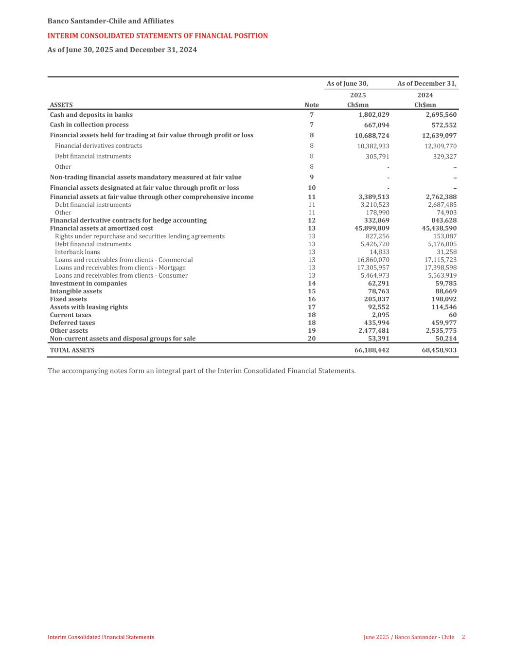Banco Santander-Chile and Affiliates INTERIM CONSOLIDATED STATEMENTS OF FINANCIAL POSITION As of June 30, 2025 and December 31, 2024 Interim Consolidated Financial Statements June 2025 / Banco Santander - Chile 2 As of June 30, As of December 31, 2025 2024 ASSETS Note Ch$mn Ch$mn Cash and deposits in banks 7 1,802,029 2,695,560 Cash in collection process 7 667,094 572,552 Financial assets held for trading at fair value through profit or loss 8 10,688,724 12,639,097 Financial derivatives contracts 8 10,382,933 12,309,770 Debt financial instruments 8 305,791 329,327 Other 8 - Non-trading financial assets mandatory measured at fair value 9 - Financial assets designated at fair value through profit or loss 10 - Financial assets at fair value through other comprehensive income 11 3,389,513 2,762,388 Debt financial instruments 11 3,210,523 2,687,485 Other 11 178,990 74,903 Financial derivative contracts for hedge accounting 12 332,869 843,628 Financial assets at amortized cost 13 45,899,809 45,438,590 Rights under repurchase and securities lending agreements 13 827,256 153,087 Debt financial instruments 13 5,426,720 5,176,005 Interbank loans 13 14,833 31,258 Loans and receivables from clients - Commercial 13 16,860,070 17,115,723 Loans and receivables from clients - Mortgage 13 17,305,957 17,398,598 Loans and receivables from clients - Consumer 13 5,464,973 5,563,919 Investment in companies 14 62,291 59,785 Intangible assets 15 78,763 88,669 Fixed assets 16 205,837 198,092 Assets with leasing rights 17 92,552 114,546 Current taxes 18 2,095 60 Deferred taxes 18 435,994 459,977 Other assets 19 2,477,481 2,535,775 Non-current assets and disposal groups for sale 20 53,391 50,214 TOTAL ASSETS 66,188,442 68,458,933 The accompanying notes form an integral part of the Interim Consolidated Financial Statements.