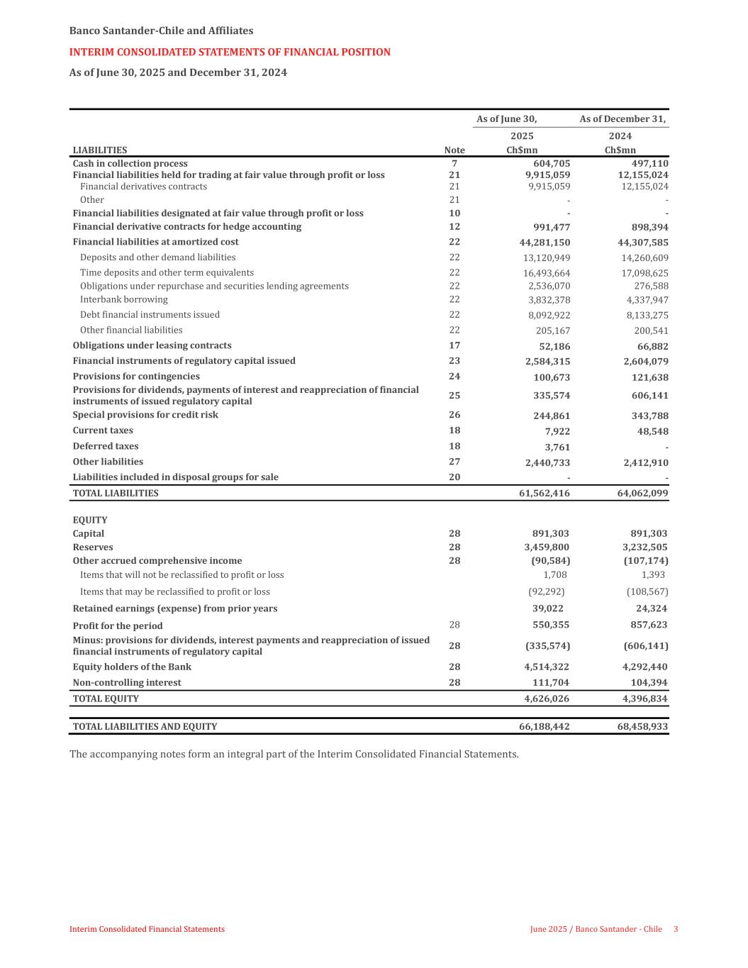 Banco Santander-Chile and Affiliates INTERIM CONSOLIDATED STATEMENTS OF FINANCIAL POSITION As of June 30, 2025 and December 31, 2024 Interim Consolidated Financial Statements June 2025 / Banco Santander - Chile 3 As of June 30, As of December 31, 2025 2024 LIABILITIES Note Ch$mn Ch$mn Cash in collection process 7 604,705 497,110 Financial liabilities held for trading at fair value through profit or loss 21 9,915,059 12,155,024 Financial derivatives contracts 21 9,915,059 12,155,024 Other 21 - - Financial liabilities designated at fair value through profit or loss 10 - - Financial derivative contracts for hedge accounting 12 991,477 898,394 Financial liabilities at amortized cost 22 44,281,150 44,307,585 Deposits and other demand liabilities 22 13,120,949 14,260,609 Time deposits and other term equivalents 22 16,493,664 17,098,625 Obligations under repurchase and securities lending agreements 22 2,536,070 276,588 Interbank borrowing 22 3,832,378 4,337,947 Debt financial instruments issued 22 8,092,922 8,133,275 Other financial liabilities 22 205,167 200,541 Obligations under leasing contracts 17 52,186 66,882 Financial instruments of regulatory capital issued 23 2,584,315 2,604,079 Provisions for contingencies 24 100,673 121,638 Provisions for dividends, payments of interest and reappreciation of financial instruments of issued regulatory capital 25 335,574 606,141 Special provisions for credit risk 26 244,861 343,788 Current taxes 18 7,922 48,548 Deferred taxes 18 3,761 - Other liabilities 27 2,440,733 2,412,910 Liabilities included in disposal groups for sale 20 - - TOTAL LIABILITIES 61,562,416 64,062,099 EQUITY Capital 28 891,303 891,303 Reserves 28 3,459,800 3,232,505 Other accrued comprehensive income 28 (90,584) (107,174) Items that will not be reclassified to profit or loss 1,708 1,393 Items that may be reclassified to profit or loss (92,292) (108,567) Retained earnings (expense) from prior years 39,022 24,324 Profit for the period 28 550,355 857,623 Minus: provisions for dividends, interest payments and reappreciation of issued financial instruments of regulatory capital 28 (335,574) (606,141) Equity holders of the Bank 28 4,514,322 4,292,440 Non-controlling interest 28 111,704 104,394 TOTAL EQUITY 4,626,026 4,396,834 TOTAL LIABILITIES AND EQUITY 66,188,442 68,458,933 The accompanying notes form an integral part of the Interim Consolidated Financial Statements.