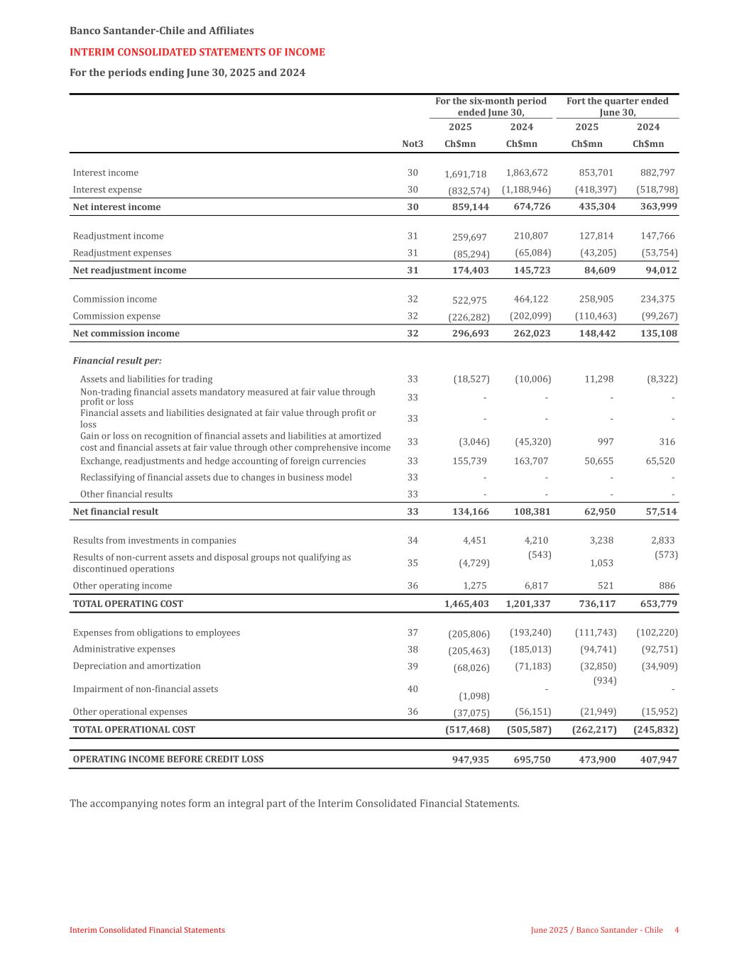 Banco Santander-Chile and Affiliates INTERIM CONSOLIDATED STATEMENTS OF INCOME For the periods ending June 30, 2025 and 2024 Interim Consolidated Financial Statements June 2025 / Banco Santander - Chile 4 For the six-month period ended June 30, Fort the quarter ended June 30, 2025 2024 2025 2024 Not3 Ch$mn Ch$mn Ch$mn Ch$mn Interest income 30 1,691,718 1,863,672 853,701 882,797 Interest expense 30 (832,574) (1,188,946) (418,397) (518,798) Net interest income 30 859,144 674,726 435,304 363,999 Readjustment income 31 259,697 210,807 127,814 147,766 Readjustment expenses 31 (85,294) (65,084) (43,205) (53,754) Net readjustment income 31 174,403 145,723 84,609 94,012 Commission income 32 522,975 464,122 258,905 234,375 Commission expense 32 (226,282) (202,099) (110,463) (99,267) Net commission income 32 296,693 262,023 148,442 135,108 Financial result per: Assets and liabilities for trading 33 (18,527) (10,006) 11,298 (8,322) Non-trading financial assets mandatory measured at fair value through profit or loss 33 - - - - Financial assets and liabilities designated at fair value through profit or loss 33 - - - - Gain or loss on recognition of financial assets and liabilities at amortized cost and financial assets at fair value through other comprehensive income 33 (3,046) (45,320) 997 316 Exchange, readjustments and hedge accounting of foreign currencies 33 155,739 163,707 50,655 65,520 Reclassifying of financial assets due to changes in business model 33 - - - - Other financial results 33 - - - - Net financial result 33 134,166 108,381 62,950 57,514 Results from investments in companies 34 4,451 4,210 3,238 2,833 Results of non-current assets and disposal groups not qualifying as discontinued operations 35 (4,729) (543) 1,053 (573) Other operating income 36 1,275 6,817 521 886 TOTAL OPERATING COST 1,465,403 1,201,337 736,117 653,779 Expenses from obligations to employees 37 (205,806) (193,240) (111,743) (102,220) Administrative expenses 38 (205,463) (185,013) (94,741) (92,751) Depreciation and amortization 39 (68,026) (71,183) (32,850) (34,909) Impairment of non-financial assets 40 (1,098) - (934) - Other operational expenses 36 (37,075) (56,151) (21,949) (15,952) TOTAL OPERATIONAL COST (517,468) (505,587) (262,217) (245,832) OPERATING INCOME BEFORE CREDIT LOSS 947,935 695,750 473,900 407,947 The accompanying notes form an integral part of the Interim Consolidated Financial Statements.