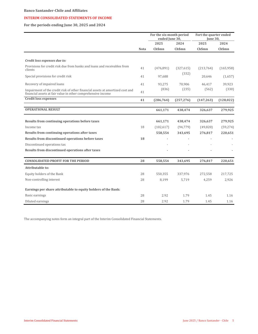 Banco Santander-Chile and Affiliates INTERIM CONSOLIDATED STATEMENTS OF INCOME For the periods ending June 30, 2025 and 2024 Interim Consolidated Financial Statements June 2025 / Banco Santander - Chile 5 For the six-month period ended June 30, Fort the quarter ended June 30, 2025 2024 2025 2024 Nota Ch$mn Ch$mn Ch$mn Ch$mn Credit loss expenses due to: Provisions for credit risk due from banks and loans and receivables from clients 41 (476,891) (327,615) (213,764) (165,958) Special provisions for credit risk 41 97,688 (332) 20,646 (1,657) Recovery of impaired loans 41 93,275 70,906 46,417 39,923 Impairment of the credit risk of other financial assets at amortized cost and financial assets at fair value in other comprehensive income 41 (836) (235) (562) (330) Credit loss expenses 41 (286,764) (257,276) (147,263) (128,022) OPERATIONAL RESULT 661,171 438,474 326,637 279,925 Results from continuing operations before taxes 661,171 438,474 326,637 279,925 Income tax 18 (102,617) (94,779) (49,820) (59,274) Results from continuing operations after taxes 558,554 343,695 276,817 220,651 Results from discontinued operations before taxes 18 - - - - Discontinued operations tax - - - - Results from discontinued operations after taxes - - - - CONSOLIDATED PROFIT FOR THE PERIOD 28 558,554 343,695 276,817 220,651 Attributable to: Equity holders of the Bank 28 550,355 337,976 272,558 217,725 Non-controlling interest 28 8,199 5,719 4,259 2,926 Earnings per share attributable to equity holders of the Bank: Basic earnings 28 2.92 1.79 1.45 1.16 Diluted earnings 28 2.92 1.79 1.45 1.16 The accompanying notes form an integral part of the Interim Consolidated Financial Statements.