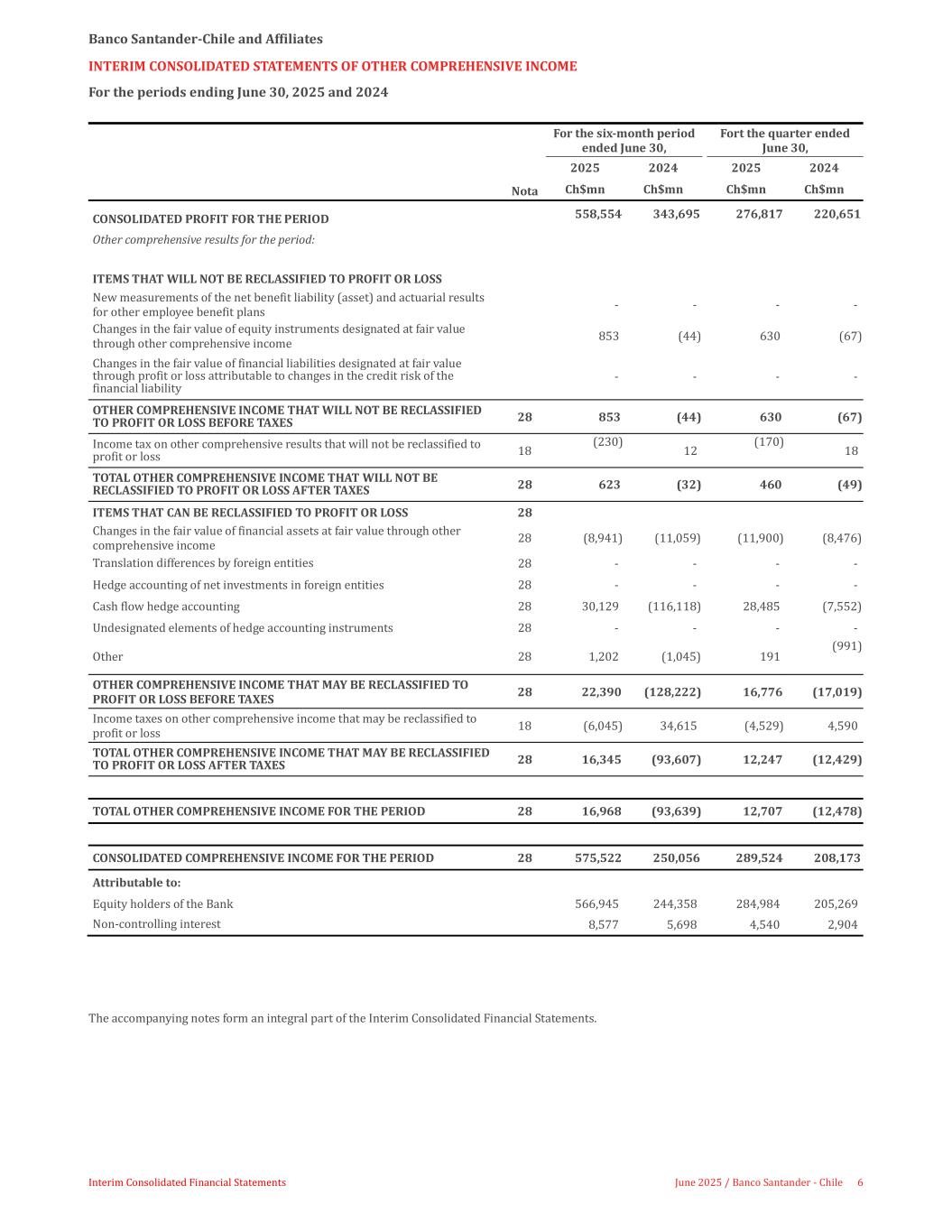 Banco Santander-Chile and Affiliates INTERIM CONSOLIDATED STATEMENTS OF OTHER COMPREHENSIVE INCOME For the periods ending June 30, 2025 and 2024 Interim Consolidated Financial Statements June 2025 / Banco Santander - Chile 6 For the six-month period ended June 30, Fort the quarter ended June 30, 31-12-2021 2025 2024 2025 2024 Nota Ch$mn Ch$mn Ch$mn Ch$mn CONSOLIDATED PROFIT FOR THE PERIOD 558,554 343,695 276,817 220,651 Other comprehensive results for the period: ITEMS THAT WILL NOT BE RECLASSIFIED TO PROFIT OR LOSS New measurements of the net benefit liability (asset) and actuarial results for other employee benefit plans - - - - Changes in the fair value of equity instruments designated at fair value through other comprehensive income 853 (44) 630 (67) Changes in the fair value of financial liabilities designated at fair value through profit or loss attributable to changes in the credit risk of the financial liability - - - - OTHER COMPREHENSIVE INCOME THAT WILL NOT BE RECLASSIFIED TO PROFIT OR LOSS BEFORE TAXES 28 853 (44) 630 (67) Income tax on other comprehensive results that will not be reclassified to profit or loss 18 (230) 12 (170) 18 TOTAL OTHER COMPREHENSIVE INCOME THAT WILL NOT BE RECLASSIFIED TO PROFIT OR LOSS AFTER TAXES 28 623 (32) 460 (49) ITEMS THAT CAN BE RECLASSIFIED TO PROFIT OR LOSS 28 Changes in the fair value of financial assets at fair value through other comprehensive income 28 (8,941) (11,059) (11,900) (8,476) Translation differences by foreign entities 28 - - - - Hedge accounting of net investments in foreign entities 28 - - - - Cash flow hedge accounting 28 30,129 (116,118) 28,485 (7,552) Undesignated elements of hedge accounting instruments 28 - - - - Other 28 1,202 (1,045) 191 (991) OTHER COMPREHENSIVE INCOME THAT MAY BE RECLASSIFIED TO PROFIT OR LOSS BEFORE TAXES 28 22,390 (128,222) 16,776 (17,019) Income taxes on other comprehensive income that may be reclassified to profit or loss 18 (6,045) 34,615 (4,529) 4,590 TOTAL OTHER COMPREHENSIVE INCOME THAT MAY BE RECLASSIFIED TO PROFIT OR LOSS AFTER TAXES 28 16,345 (93,607) 12,247 (12,429) TOTAL OTHER COMPREHENSIVE INCOME FOR THE PERIOD 28 16,968 (93,639) 12,707 (12,478) CONSOLIDATED COMPREHENSIVE INCOME FOR THE PERIOD 28 575,522 250,056 289,524 208,173 Attributable to: Equity holders of the Bank 566,945 244,358 284,984 205,269 Non-controlling interest 8,577 5,698 4,540 2,904 The accompanying notes form an integral part of the Interim Consolidated Financial Statements.