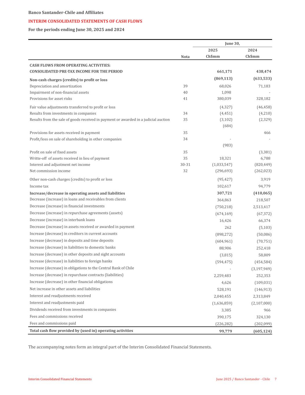 Banco Santander-Chile and Affiliates INTERIM CONSOLIDATED STATEMENTS OF CASH FLOWS For the periods ending June 30, 2025 and 2024 Interim Consolidated Financial Statements June 2025 / Banco Santander - Chile 7 June 30, 2025 2024 Nota Ch$mm Ch$mm CASH FLOWS FROM OPERATING ACTIVITIES: CONSOLIDATED PRE-TAX INCOME FOR THE PERIOD 661,171 438,474 Non-cash charges (credits) to profit or loss (869,113) (633,533) Depreciation and amortization 39 68,026 71,183 Impairment of non-financial assets 40 1,098 - Provisions for asset risks 41 380,039 328,182 Fair value adjustments transferred to profit or loss (4,327) (46,458) Results from investments in companies 34 (4,451) (4,210) Results from the sale of goods received in payment or awarded in a judicial auction 35 (3,102) (2,329) Provisions for assets received in payment 35 (684) 466 Profit/loss on sale of shareholding in other companies 34 - - Profit on sale of fixed assets 35 (983) (3,381) Writte-off of assets received in lieu of payment 35 18,321 6,788 Interest and adjustment net income 30-31 (1,033,547) (820,449) Net commission income 32 (296,693) (262,023) Other non-cash charges (credits) to profit or loss (95,427) 3,919 Income tax 102,617 94,779 Increase/decrease in operating assets and liabilities 307,721 (410,065) Decrease (increase) in loans and receivables from clients 364,863 218,507 Decrease (increase) in financial investments (750,218) 2,513,417 Decrease (increase) in repurchase agreements (assets) (674,169) (67,372) Decrease (increase) in interbank loans 16,426 66,374 Decrease (increase) in assets received or awarded in payment 262 (5,103) Increase (decrease) in creditors in current accounts (898,272) (50,086) Increase (decrease) in deposits and time deposits (604,961) (70,751) Increase (decrease) in liabilities to domestic banks 88,906 252,418 Increase (decrease) in other deposits and sight accounts (3,815) 58,809 Increase (decrease) in liabilities to foreign banks (594,475) (454,584) Increase (decrease) in obligations to the Central Bank of Chile - (3,197,949) Increase (decrease) in repurchase contracts (liabilities) 2,259,483 252,353 Increase (decrease) in other financial obligations 4,626 (109,031) Net increase in other assets and liabilities 528,191 (146,913) Interest and readjustments received 2,040,455 2,313,849 Interest and readjustments paid (1,636,859) (2,107,000) Dividends received from investments in companies 3,385 966 Fees and commissions received 390,175 324,130 Fees and commissions paid (226,282) (202,099) Total cash flow provided by (used in) operating activities 99,779 (605,124) The accompanying notes form an integral part of the Interim Consolidated Financial Statements.