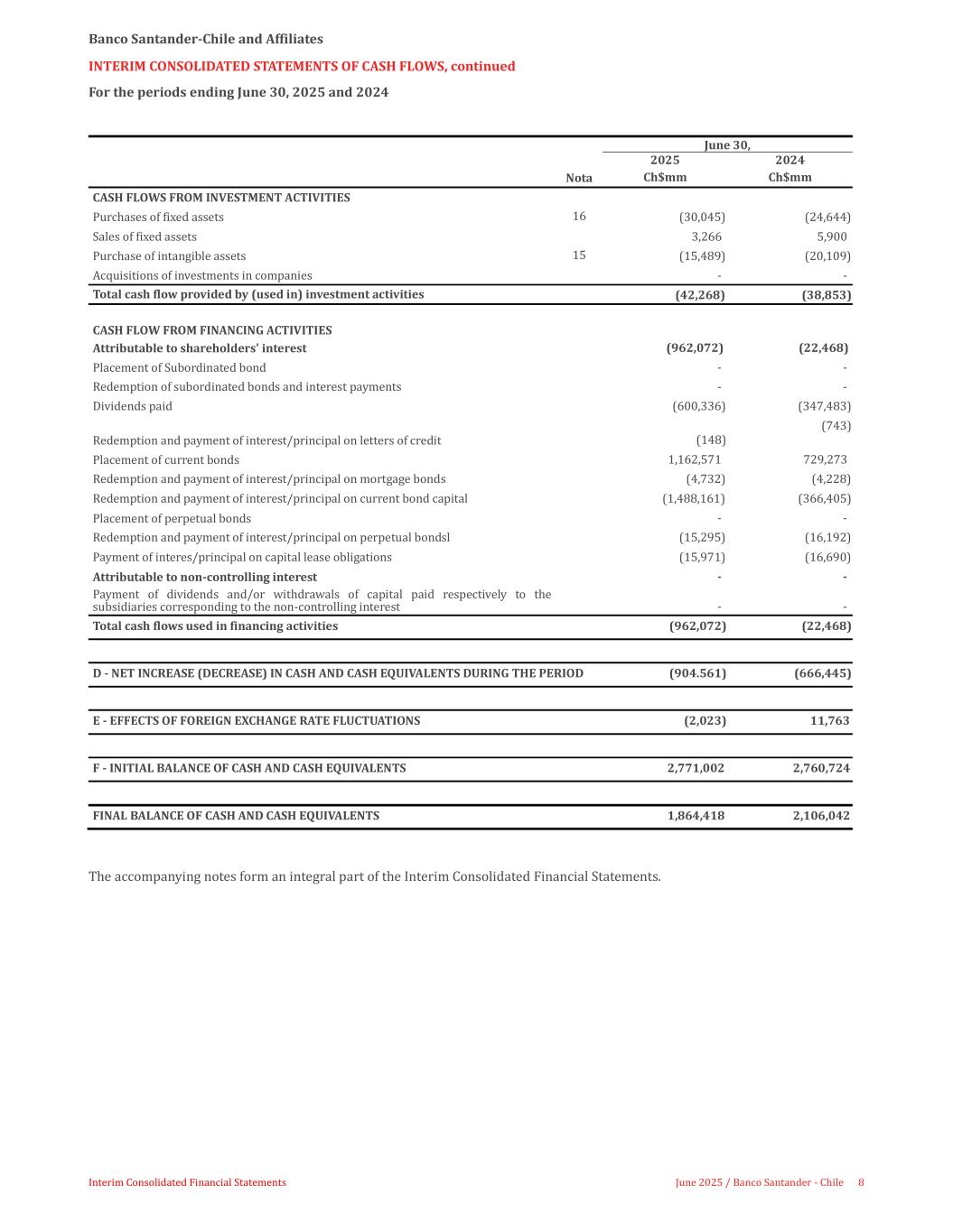 Banco Santander-Chile and Affiliates INTERIM CONSOLIDATED STATEMENTS OF CASH FLOWS, continued For the periods ending June 30, 2025 and 2024 Interim Consolidated Financial Statements June 2025 / Banco Santander - Chile 8 June 30, 2025 2024 Nota Ch$mm Ch$mm CASH FLOWS FROM INVESTMENT ACTIVITIES Purchases of fixed assets 16 (30,045) (24,644) Sales of fixed assets 3,266 5,900 Purchase of intangible assets 15 (15,489) (20,109) Acquisitions of investments in companies - - Total cash flow provided by (used in) investment activities (42,268) (38,853) CASH FLOW FROM FINANCING ACTIVITIES Attributable to shareholders' interest (962,072) (22,468) Placement of Subordinated bond - - Redemption of subordinated bonds and interest payments - - Dividends paid (600,336) (347,483) Redemption and payment of interest/principal on letters of credit (148) (743) Placement of current bonds 1,162,571 729,273 Redemption and payment of interest/principal on mortgage bonds (4,732) (4,228) Redemption and payment of interest/principal on current bond capital (1,488,161) (366,405) Placement of perpetual bonds - - Redemption and payment of interest/principal on perpetual bondsl (15,295) (16,192) Payment of interes/principal on capital lease obligations (15,971) (16,690) Attributable to non-controlling interest - - Payment of dividends and/or withdrawals of capital paid respectively to the subsidiaries corresponding to the non-controlling interest - - Total cash flows used in financing activities (962,072) (22,468) D - NET INCREASE (DECREASE) IN CASH AND CASH EQUIVALENTS DURING THE PERIOD (904.561) (666,445) E - EFFECTS OF FOREIGN EXCHANGE RATE FLUCTUATIONS (2,023) 11,763 F - INITIAL BALANCE OF CASH AND CASH EQUIVALENTS 2,771,002 2,760,724 FINAL BALANCE OF CASH AND CASH EQUIVALENTS 1,864,418 2,106,042 The accompanying notes form an integral part of the Interim Consolidated Financial Statements.