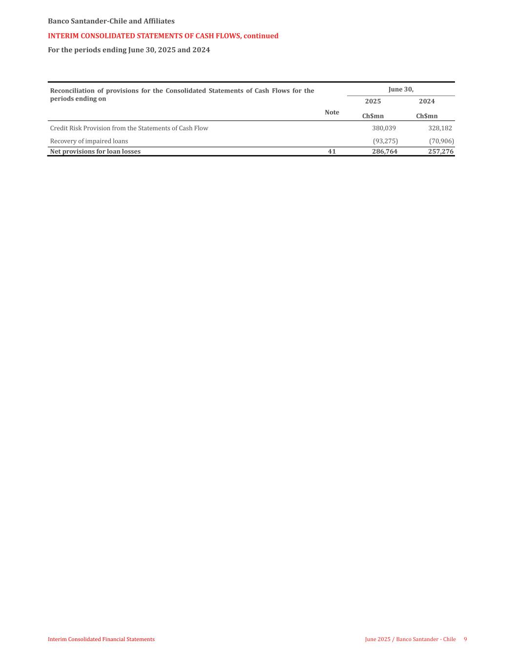 Banco Santander-Chile and Affiliates INTERIM CONSOLIDATED STATEMENTS OF CASH FLOWS, continued For the periods ending June 30, 2025 and 2024 Interim Consolidated Financial Statements June 2025 / Banco Santander - Chile 9 Reconciliation of provisions for the Consolidated Statements of Cash Flows for the periods ending on June 30, 2025 2024 Note Ch$mn Ch$mn Credit Risk Provision from the Statements of Cash Flow 380,039 328,182 Recovery of impaired loans (93,275) (70,906) Net provisions for loan losses 41 286,764 257,276