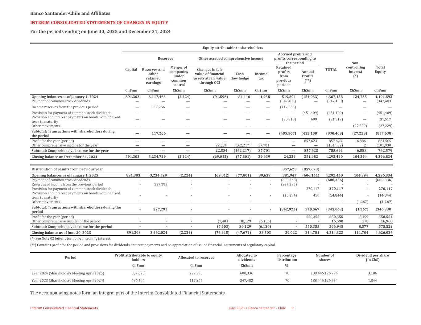 Banco Santander-Chile and Affiliates INTERIM CONSOLIDATED STATEMENTS OF CHANGES IN EQUITY For the periods ending on June 30, 2025 and December 31, 2024 Interim Consolidated Financial Statements June 2025 / Banco Santander - Chile 11 Equity attributable to shareholders Capital Reserves Other accrued comprehensive income Accrued profits and profits corresponding to the period TOTAL Non- controlling interest (*) Total EquityReserves and other retained earnings Merger of companies under common control Changes in fair value of financial assets at fair value through OCI Cash flow hedge Income tax Retained profits from previous periods Annual Profits (**) Ch$mn Ch$mn Ch$mn Ch$mn Ch$mn Ch$mn Ch$mn Ch$mn Ch$mn Ch$mn Ch$mn Opening balances as of January 1, 2024 891,303 3,117,463 (2,224) (91,596) 84,416 1,938 519,891 (154,033) 4,367,158 124,735 4,491,893 Payment of common stock dividends (347,483) (347,483) (347,483) Income reserves from the previous period 117,266 (117,266) Provision for payment of common stock dividends (451,409) (451,409) (451,409) Provision and interest payments on bonds with no fixed term to maturity (30,818) (699) (31,517) (31,517) Other movements (27,229) (27,229) Subtotal: Transactions with shareholders during the period 117,266 (495,567) (452,108) (830,409) (27,229) (857,638) Profit for the year (period) 857,623 857,623 6,886 864,509 Other comprehensive income for the year 22,584 (162,217) 37,701 (101,932) 2 (101,930) Subtotal: Comprehensive income for the year 22,584 (162,217) 37,701 857,623 755,691 6,888 762,579 Closing balance on December 31, 2024 891,303 3,234,729 (2,224) (69,012) (77,801) 39,639 24,324 251,482 4,292,440 104,394 4,396,834 Distribution of results from previous year 857,623 (857,623) Opening balances as of January 1, 2025 891,303 3,234,729 (2,224) (69,012) (77,801) 39,639 881,947 (606,141) 4,292,440 104,394 4,396,834 Payment of common stock dividends - - - - - - (600,336) - (600,336) - (600,336) Reserves of income from the previous period - 227,295 - - - - (227,295) - - - - Provision for payment of common stock dividends - - - - - - - 270,117 270,117 - 270,117 Provision and interest payments on bonds with no fixed term to maturity - - - - - - (15,294) 450 (14,844) - (14,844) Other movements - - - - - - - - - (1,267) (1,267) Subtotal: Transactions with shareholders during the period - 227,295 - - - - (842,925) 270,567 (345,063) (1,267) (346,330) Profit for the year (period) - - - - - - - 550,355 550,355 8,199 558,554 Other comprehensive results for the period - - - (7,403) 30,129 (6,136) - - 16,590 378 16,968 Subtotal: Comprehensive income for the period - - - (7,403) 30,129 (6,136) - 550,355 566,945 8,577 575,522 Closing balance as of June 30, 2025 891,303 3,462,024 (2,224) (76,415) (47,672) 33,503 39,022 214,781 4,514,322 111,704 4,626,026 (*) See Note 02 letter c for non-controlling interest, (**) Contains profit for the period and provisions for dividends, interest payments and re-appreciation of issued financial instruments of regulatory capital. Period Profit attributable to equity holders Allocated to reserves Allocated to dividends Percentage distribution Number of shares Dividend per share (In Ch$) Ch$mn Ch$mn Ch$mn % Year 2024 (Shareholders Meeting April 2025) 857,623 227,295 600,336 70 188,446,126,794 3.186 Year 2023 (Shareholders Meeting April 2024) 496,404 117,266 347,483 70 188,446,126,794 1.844 The accompanying notes form an integral part of the Interim Consolidated Financial Statements.