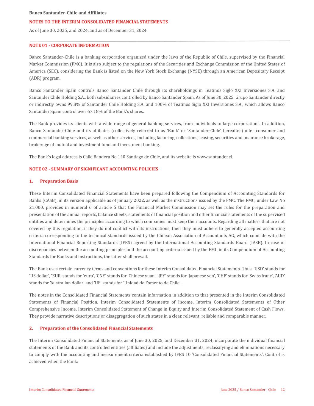 Banco Santander-Chile and Affiliates NOTES TO THE INTERIM CONSOLIDATED FINANCIAL STATEMENTS As of June 30, 2025, and 2024, and as of December 31, 2024 Interim Consolidated Financial Statements June 2025 / Banco Santander - Chile 12 NOTE 01 - CORPORATE INFORMATION Banco Santander-Chile is a banking corporation organized under the laws of the Republic of Chile, supervised by the Financial Market Commission (FMC). It is also subject to the regulations of the Securities and Exchange Commission of the United States of America (SEC), considering the Bank is listed on the New York Stock Exchange (NYSE) through an American Depositary Receipt (ADR) program. Banco Santander Spain controls Banco Santander Chile through its shareholdings in Teatinos Siglo XXI Inversiones S.A. and Santander Chile Holding S.A., both subsidiaries controlled by Banco Santander Spain. As of June 30, 2025, Grupo Santander directly or indirectly owns 99.8% of Santander Chile Holding S.A. and 100% of Teatinos Siglo XXI Inversiones S.A., which allows Banco Santander Spain control over 67.18% of the Bank's shares. The Bank provides its clients with a wide range of general banking services, from individuals to large corporations. In addition, Banco Santander-Chile and its affiliates (collectively referred to as 'Bank' or 'Santander-Chile' hereafter) offer consumer and commercial banking services, as well as other services, including factoring, collections, leasing, securities and insurance brokerage, brokerage of mutual and investment fund and investment banking. The Bank's legal address is Calle Bandera No 140 Santiago de Chile, and its website is www.santander.cl. NOTE 02 - SUMMARY OF SIGNIFICANT ACCOUNTING POLICIES 1. Preparation Basis These Interim Consolidated Financial Statements have been prepared following the Compendium of Accounting Standards for Banks (CASB), in its version applicable as of January 2022, as well as the instructions issued by the FMC. The FMC, under Law No 21,000, provides in numeral 6 of article 5 that the Financial Market Commission may set the rules for the preparation and presentation of the annual reports, balance sheets, statements of financial position and other financial statements of the supervised entities and determines the principles according to which companies must keep their accounts. Regarding all matters that are not covered by this regulation, if they do not conflict with its instructions, then they must adhere to generally accepted accounting criteria corresponding to the technical standards issued by the Chilean Association of Accountants AG, which coincide with the International Financial Reporting Standards (IFRS) agreed by the International Accounting Standards Board (IASB). In case of discrepancies between the accounting principles and the accounting criteria issued by the FMC in its Compendium of Accounting Standards for Banks and instructions, the latter shall prevail. The Bank uses certain currency terms and conventions for these Interim Consolidated Financial Statements. Thus, 'USD' stands for 'US dollar', 'EUR' stands for 'euro', 'CNY' stands for 'Chinese yuan', 'JPY' stands for 'Japanese yen', 'CHF' stands for 'Swiss franc', 'AUD' stands for 'Australian dollar' and 'UF' stands for 'Unidad de Fomento de Chile'. The notes in the Consolidated Financial Statements contain information in addition to that presented in the Interim Consolidated Statements of Financial Position, Interim Consolidated Statements of Income, Interim Consolidated Statements of Other Comprehensive Income, Interim Consolidated Statement of Change in Equity and Interim Consolidated Statement of Cash Flows. They provide narrative descriptions or disaggregation of such states in a clear, relevant, reliable and comparable manner. 2. Preparation of the Consolidated Financial Statements The Interim Consolidated Financial Statements as of June 30, 2025, and December 31, 2024, incorporate the individual financial statements of the Bank and its controlled entities (affiliates) and include the adjustments, reclassifying and eliminations necessary to comply with the accounting and measurement criteria established by IFRS 10 'Consolidated Financial Statements'. Control is achieved when the Bank:
