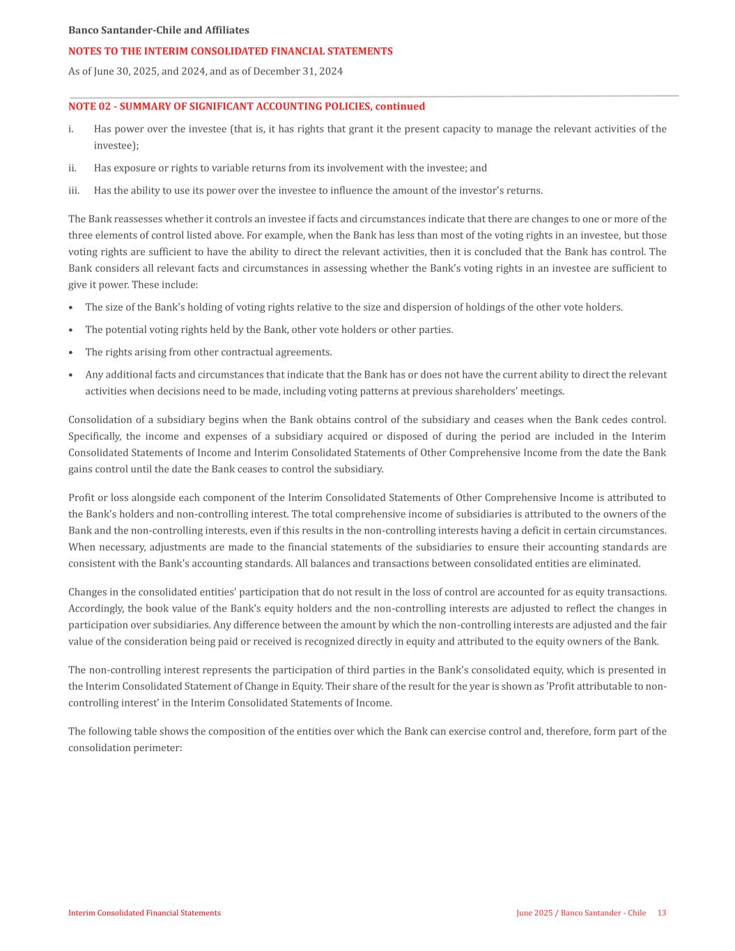 Banco Santander-Chile and Affiliates NOTES TO THE INTERIM CONSOLIDATED FINANCIAL STATEMENTS As of June 30, 2025, and 2024, and as of December 31, 2024 Interim Consolidated Financial Statements June 2025 / Banco Santander - Chile 13 NOTE 02 - SUMMARY OF SIGNIFICANT ACCOUNTING POLICIES, continued i. Has power over the investee (that is, it has rights that grant it the present capacity to manage the relevant activities of the investee); ii. Has exposure or rights to variable returns from its involvement with the investee; and iii. Has the ability to use its power over the investee to influence the amount of the investor's returns. The Bank reassesses whether it controls an investee if facts and circumstances indicate that there are changes to one or more of the three elements of control listed above. For example, when the Bank has less than most of the voting rights in an investee, but those voting rights are sufficient to have the ability to direct the relevant activities, then it is concluded that the Bank has control. The Bank considers all relevant facts and circumstances in assessing whether the Bank's voting rights in an investee are sufficient to give it power. These include: The size of the Bank's holding of voting rights relative to the size and dispersion of holdings of the other vote holders. The potential voting rights held by the Bank, other vote holders or other parties. The rights arising from other contractual agreements. Any additional facts and circumstances that indicate that the Bank has or does not have the current ability to direct the relevant activities when decisions need to be made, including voting patterns at previous shareholders' meetings. Consolidation of a subsidiary begins when the Bank obtains control of the subsidiary and ceases when the Bank cedes control. Specifically, the income and expenses of a subsidiary acquired or disposed of during the period are included in the Interim Consolidated Statements of Income and Interim Consolidated Statements of Other Comprehensive Income from the date the Bank gains control until the date the Bank ceases to control the subsidiary. Profit or loss alongside each component of the Interim Consolidated Statements of Other Comprehensive Income is attributed to the Bank's holders and non-controlling interest. The total comprehensive income of subsidiaries is attributed to the owners of the Bank and the non-controlling interests, even if this results in the non-controlling interests having a deficit in certain circumstances. When necessary, adjustments are made to the financial statements of the subsidiaries to ensure their accounting standards are consistent with the Bank's accounting standards. All balances and transactions between consolidated entities are eliminated. Changes in the consolidated entities' participation that do not result in the loss of control are accounted for as equity transactions. -controlling interests are adjusted to reflect the changes in participation over subsidiaries. Any difference between the amount by which the non-controlling interests are adjusted and the fair value of the consideration being paid or received is recognized directly in equity and attributed to the equity owners of the Bank. The non-controlling interest represents the participation of third parties in the Bank's consolidated equity, which is presented in the Interim Consolidated Statement of Change in Equity. Their share of the result for the year is shown as 'Profit attributable to non- controlling interest' in the Interim Consolidated Statements of Income. The following table shows the composition of the entities over which the Bank can exercise control and, therefore, form part of the consolidation perimeter: