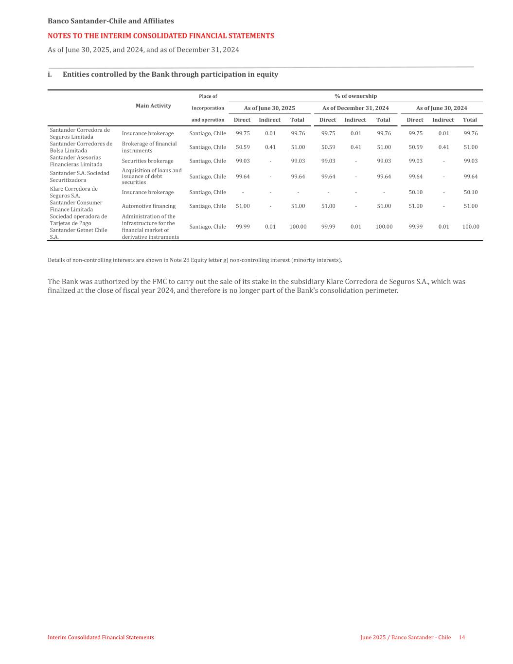 Banco Santander-Chile and Affiliates NOTES TO THE INTERIM CONSOLIDATED FINANCIAL STATEMENTS As of June 30, 2025, and 2024, and as of December 31, 2024 Interim Consolidated Financial Statements June 2025 / Banco Santander - Chile 14 i. Entities controlled by the Bank through participation in equity Place of % of ownership Main Activity Incorporation As of June 30, 2025 As of December 31, 2024 As of June 30, 2024 and operation Direct Indirect Total Direct Indirect Total Direct Indirect Total Santander Corredora de Seguros Limitada Insurance brokerage Santiago, Chile 99.75 0.01 99.76 99.75 0.01 99.76 99.75 0.01 99.76 Santander Corredores de Bolsa Limitada Brokerage of financial instruments Santiago, Chile 50.59 0.41 51.00 50.59 0.41 51.00 50.59 0.41 51.00 Santander Asesorias Financieras Limitada Securities brokerage Santiago, Chile 99.03 - 99.03 99.03 - 99.03 99.03 - 99.03 Santander S.A. Sociedad Securitizadora Acquisition of loans and issuance of debt securities Santiago, Chile 99.64 - 99.64 99.64 - 99.64 99.64 - 99.64 Klare Corredora de Seguros S.A. Insurance brokerage Santiago, Chile - - - - - - 50.10 - 50.10 Santander Consumer Finance Limitada Automotive financing Santiago, Chile 51.00 - 51.00 51.00 - 51.00 51.00 - 51.00 Sociedad operadora de Tarjetas de Pago Santander Getnet Chile S.A. Administration of the infrastructure for the financial market of derivative instruments Santiago, Chile 99.99 0.01 100.00 99.99 0.01 100.00 99.99 0.01 100.00 Details of non-controlling interests are shown in Note 28 Equity letter g) non-controlling interest (minority interests). The Bank was authorized by the FMC to carry out the sale of its stake in the subsidiary Klare Corredora de Seguros S.A., which was