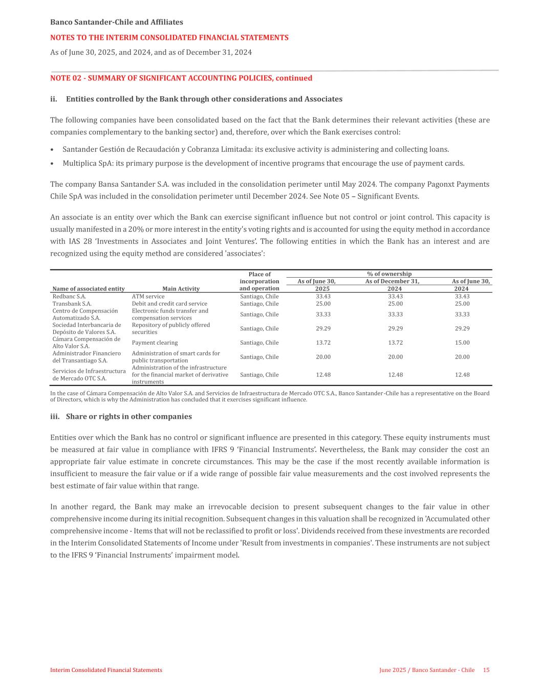 Banco Santander-Chile and Affiliates NOTES TO THE INTERIM CONSOLIDATED FINANCIAL STATEMENTS As of June 30, 2025, and 2024, and as of December 31, 2024 Interim Consolidated Financial Statements June 2025 / Banco Santander - Chile 15 NOTE 02 - SUMMARY OF SIGNIFICANT ACCOUNTING POLICIES, continued ii. Entities controlled by the Bank through other considerations and Associates The following companies have been consolidated based on the fact that the Bank determines their relevant activities (these are companies complementary to the banking sector) and, therefore, over which the Bank exercises control: Santander Gestión de Recaudación y Cobranza Limitada: its exclusive activity is administering and collecting loans. Multiplica SpA: its primary purpose is the development of incentive programs that encourage the use of payment cards. The company Bansa Santander S.A. was included in the consolidation perimeter until May 2024. The company Pagonxt Payments Chile SpA was included in the consolidation perimeter until December 2024. See Note 05 Significant Events. An associate is an entity over which the Bank can exercise significant influence but not control or joint control. This capacity is usually manifested in a 20% or more interest in the entity's voting rights and is accounted for using the equity method in accordance recognized using the equity method are considered 'associates': Place of incorporation and operation % of ownership As of June 30, As of December 31, As of June 30, Name of associated entity Main Activity 2025 2024 2024 Redbanc S.A. ATM service Santiago, Chile 33.43 33.43 33.43 Transbank S.A. Debit and credit card service Santiago, Chile 25.00 25.00 25.00 Centro de Compensación Automatizado S.A. Electronic funds transfer and compensation services Santiago, Chile 33.33 33.33 33.33 Sociedad Interbancaria de Depósito de Valores S.A. Repository of publicly offered securities Santiago, Chile 29.29 29.29 29.29 Cámara Compensación de Alto Valor S.A. Payment clearing Santiago, Chile 13.72 13.72 15.00 Administrador Financiero del Transantiago S.A. Administration of smart cards for public transportation Santiago, Chile 20.00 20.00 20.00 Servicios de Infraestructura de Mercado OTC S.A. Administration of the infrastructure for the financial market of derivative instruments Santiago, Chile 12.48 12.48 12.48 In the case of Cámara Compensación de Alto Valor S.A. and Servicios de Infraestructura de Mercado OTC S.A., Banco Santander-Chile has a representative on the Board of Directors, which is why the Administration has concluded that it exercises significant influence. iii. Share or rights in other companies Entities over which the Bank has no control or significant influence are presented in this category. These equity instruments must appropriate fair value estimate in concrete circumstances. This may be the case if the most recently available information is insufficient to measure the fair value or if a wide range of possible fair value measurements and the cost involved represents the best estimate of fair value within that range. In another regard, the Bank may make an irrevocable decision to present subsequent changes to the fair value in other comprehensive income during its initial recognition. Subsequent changes in this valuation shall be recognized in 'Accumulated other comprehensive income - Items that will not be reclassified to profit or loss'. Dividends received from these investments are recorded in the Interim Consolidated Statements of Income under 'Result from investments in companies'. These instruments are not subject